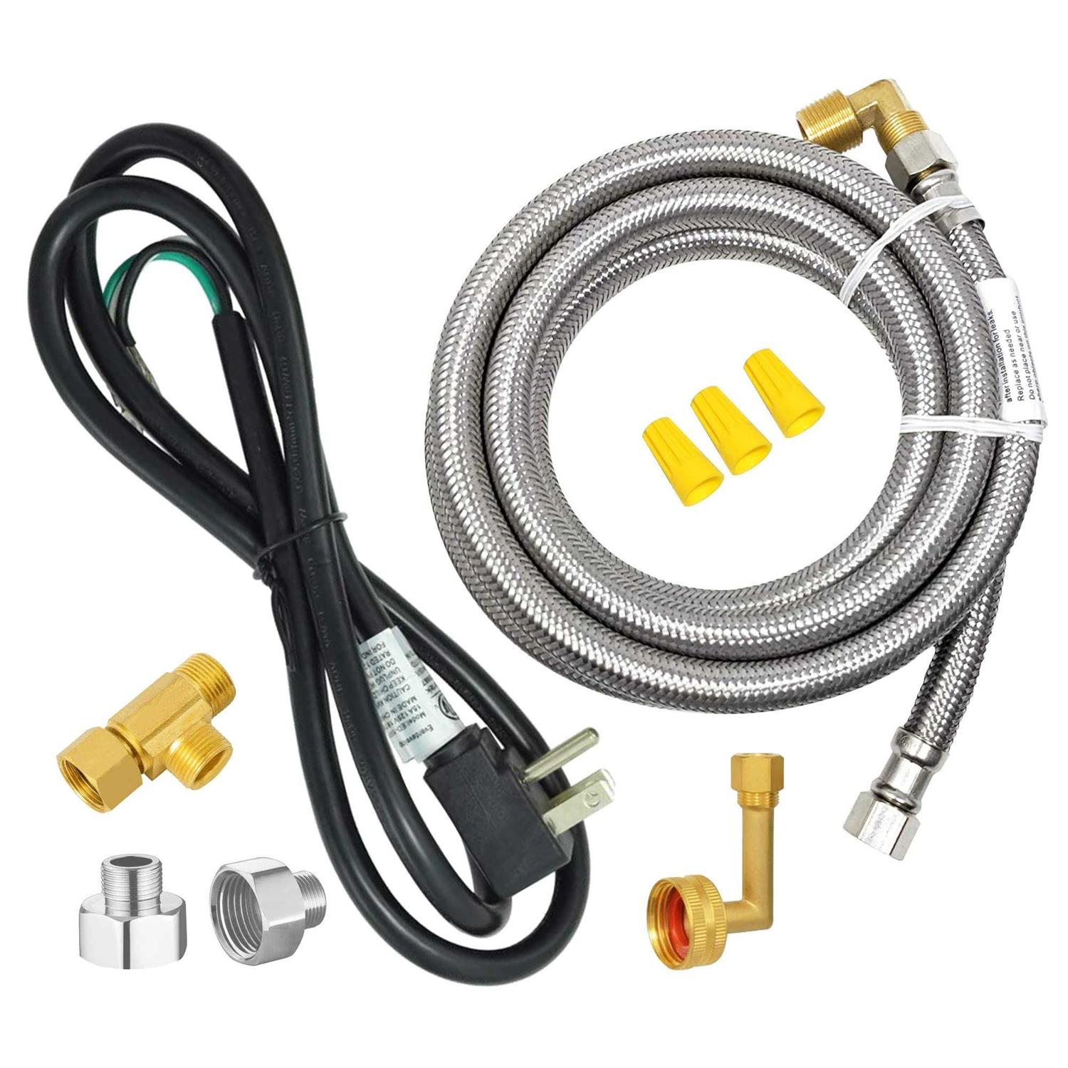 Universal Dishwasher Installation Kit Stainless Steel Braided 6 Ft. Water Supply Hose, 3-Wire 6 Power Cord, 3/8 Compression Connectors and T Fitting