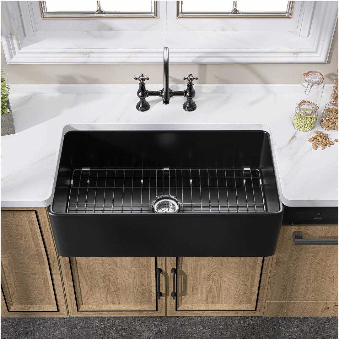 Ogonbrick Black Farmhouse Sink Single Bowl Fireclay Farmhouse Kitchen Sink with Sink Grid and Basket Strainer