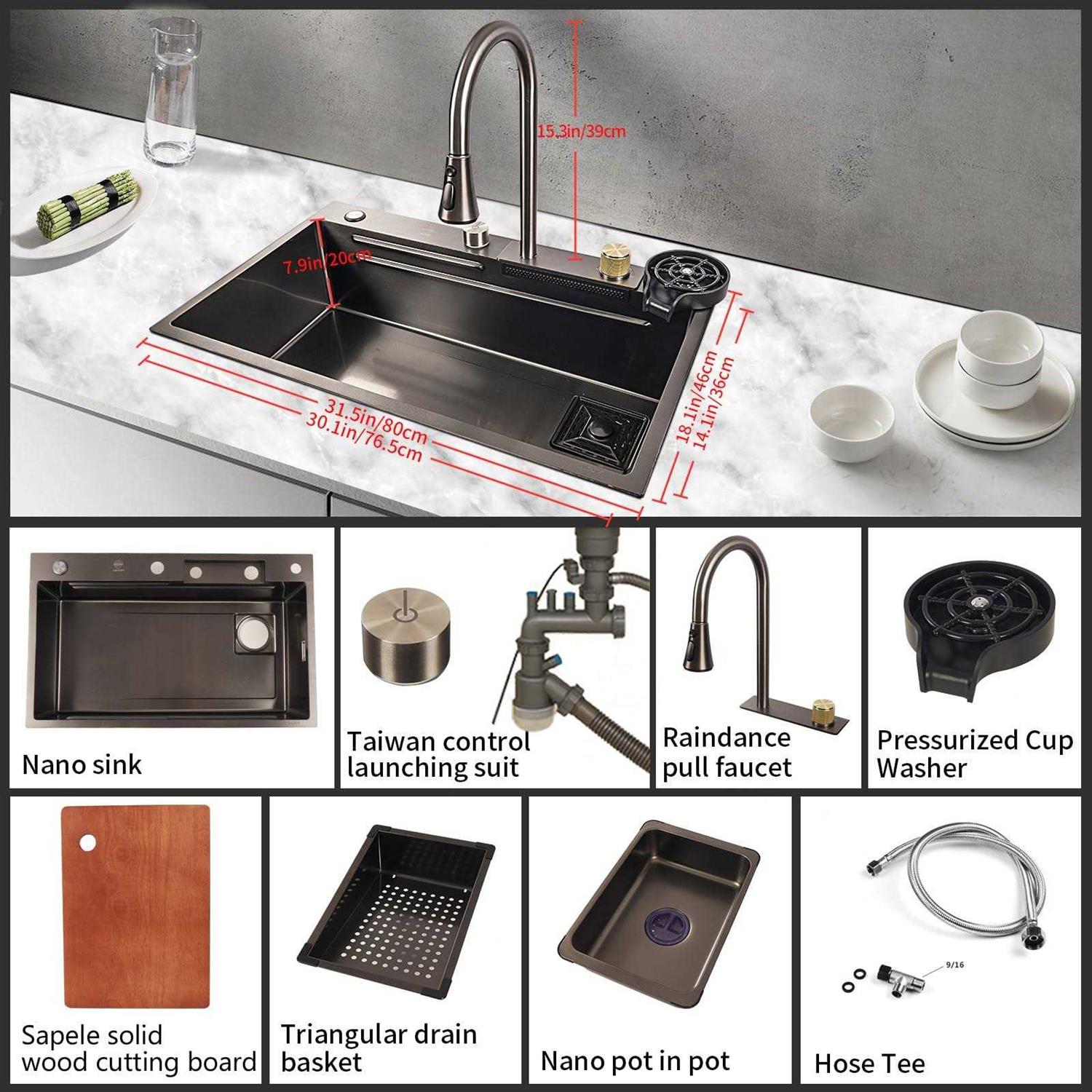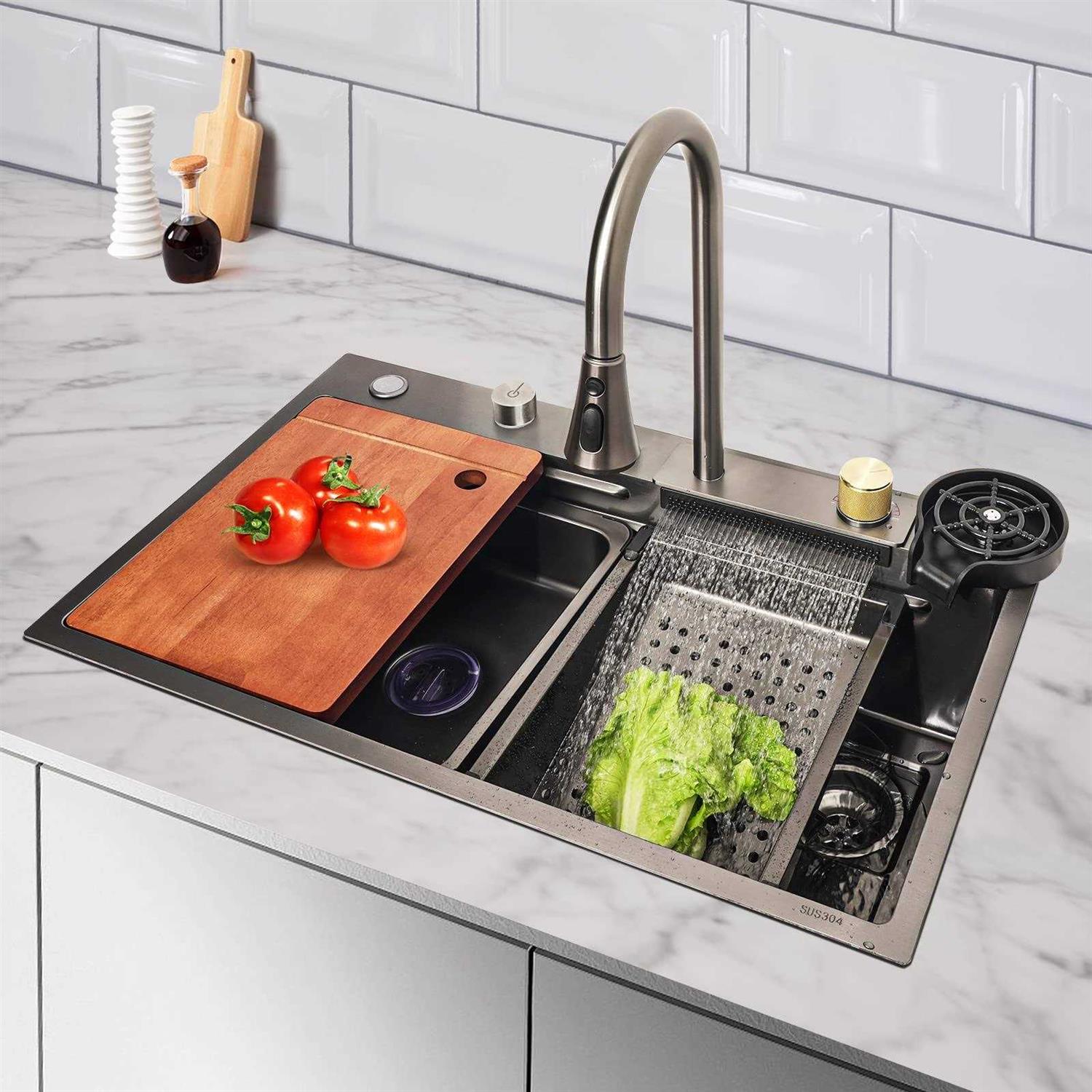 Pehohe Kitchen Sinks Waterfall Kitchen Sink Set 304 Stainless Steel Nano Sink Home Sink Vegetable Basin with Pull-out Faucet,Add Pressurized Sink