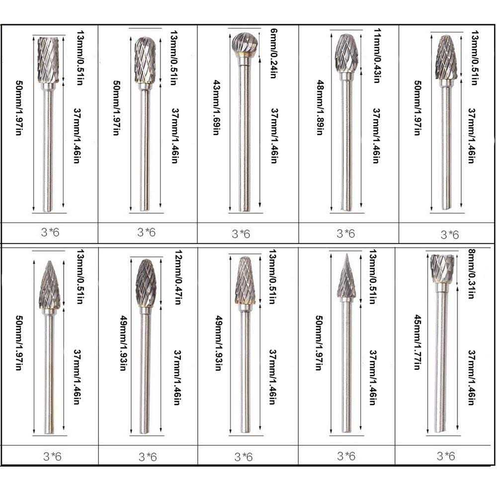 【Applicable to Various Scenarios】Tungsten carbide burr set is suitable for woodworking, handicrafts, such as wood, pp, laminate and aluminum, etc., seamless, iron pipe, aluminum, copper rod and high hardness pp material composite materials, etc. 【High Speed Operation】The tungsten steel tungsten carbide burrs adopts high-quality technology and combines high-quality raw materials to ensure that the product has a small amplitude and low noise during high-speed operation. 【High Performance Carbon Steel】 Tungsten grinding head is made of high-performance carbon steel material, providing 200 times the life of traditional grinding heads. 【Adapt to Long Term Cutting】The tungsten steel die grinder bits are very strong and durable, the grinding speed is fast, and they can adapt to long-term cutting. 【Durable Box】10 pieces of metal grinding heads are packed in a small pp box for safe storage and protection, no need to organize, always keep it neat and tidy. Tungsten Carbide cutter Rotary Burr Set CNC Engraving Bit br / 2. Type: Rotary Burr br / 3. High production efficiency br / 4. Long service life br / 5. Easy to use, safe and reliable br / br / Shank diameter: 3mm (About 1/8”) br / Cutting edge diameter: 6mm br / Total length: 40mm br / Pack size: 10pcs br / br / Package included: br / 10pcs Tungsten Carbide cutter Rotary Burr Set in a pack br /