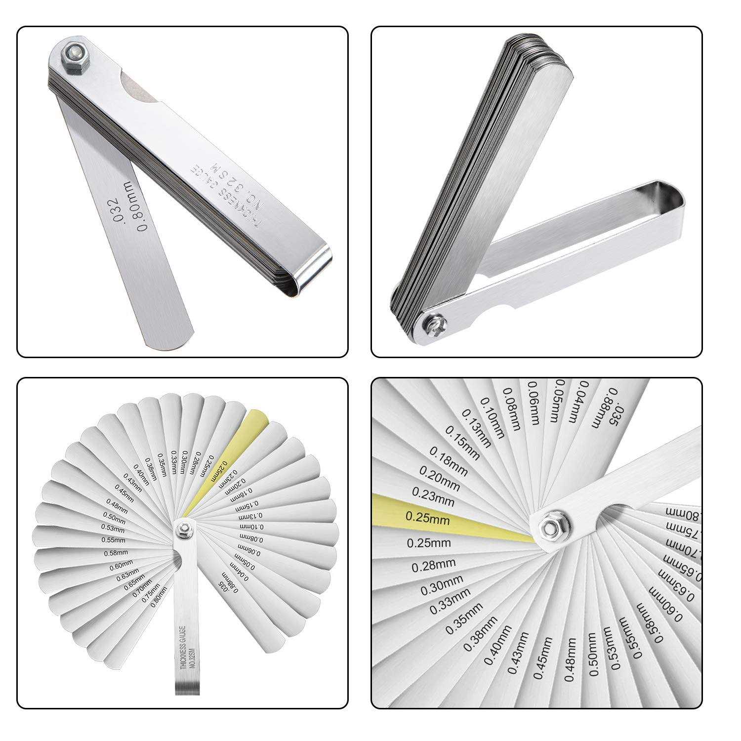 15 Pieces Guitar Luthier Tools Set Including Guitar Radius Gauge, String Action Ruler Gauge, 32 Blades Feeler Gauge, Guitar Notched Radius Gauges for Guitar and Bass Setup Features: The guitar feeler gauge set is made of quality stainless steel, anti-rust and sturdy, ensures long-term use. Foldable feeler gauge: The guitar feeler gauge measures from 0.0015 inch/ 0.038 mm to 0.035 inch/ 0.889 mm, can be applied for guitar spacing chord distance measuring. String action gauge ruler: The pocket-sized string action gauge ruler is marked metric and imperial scale to measure string height, bridge saddle height, saddle slot depth, pickup polepiece height, fret slot depth and nut height, easy to read. Wide use: Suitable for measure string instruments such as electric guitar, electric bass, acoustic guitar, acoustic guitar, electric box guitar fretboard measured in radians, radians to adjust the strings piano code. Easy to apply: All the gauges are in different scales, you can use them to measure your guitar according to your own requirements. Specification: Material: stainless steel Graduations displayed: mm and inch Color: silver Package includes: 4 x Notched radius gauges 9 x Understring radius gauges 1 x String action ruler 1 x Set of feeler gauge Quality material: these guitar gauge set is made of stainless steel with rounded off edge, rustproof and corrosion-resistant, won’t scratch or hurt your hands, durable for long-term use Foldable feeler gauge: the feeler gauge applies tempered steel, measurement ranges from 0.0015 inch/ 0.038 mm to 0.035 inch/ 0.889 mm, a common distance measuring tool for guitar spacing chord, the chrome plated main shaft makes it easy to clean up Understring radius gauge: comes in 9 sizes: 7.25 inch, 9.5 inch, 10 inch, 12 inch, 14 inch, 15 inch, 16 inch, 17 inch, 20 inch String action gauge ruler: the pocket-sized gauge ruler is marked with metric and imperial scale respectively on 2 sides, can be applied to measure string height, bridge saddle height, saddle slot depth, pickup polepiece height, fret slot depth and nut height Notched radius gauge: includes 2 narrow radius gauges and 2 wide radius gauges in 7.25 inch, 9.5 inch, 10 inch, 12 inch, 14 inch, 15 inch, 16 inch, 20 inch radius, stays parallel to the fingerboard, quickly and accurately find the curvature of a fingerboard or bridge with these radius gauges without taking the strings off