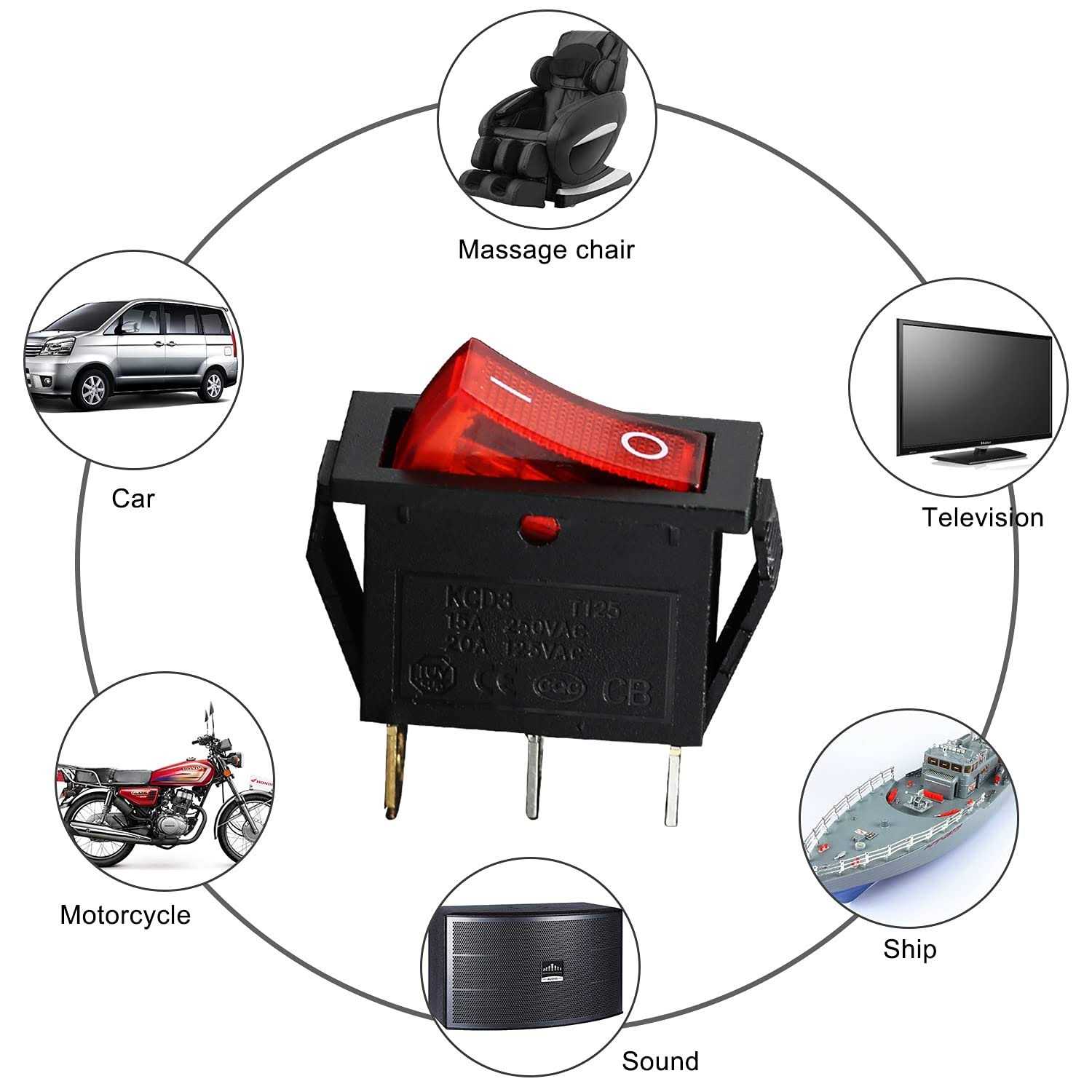 Model : KCD3-101;Type : ON-OFF(SPST) Terminals : 3 Pin;Rating Voltage : AC 250V 15A, AC 125V 20A Total Size(Each) : 30 x 14 x 39 mm (L*W*T);Mount Size : 26 x 10 x 30 mm (L*W*Depth) Material : Plastic & Metal Total Weight : 37g;Package Content : 5 x Rocker Switches The Rocker Boat Switches mainly used for many car, motorcycle, boat, some machine,water dispenser, etc. EASY TO USE: These switches snap into place so you can replace your old or damaged switches with little effort. It is a Single Pole Single Throw switch which means you can control one action/ item with the push of the switch. Lamp Color:Red Color:Black,Red