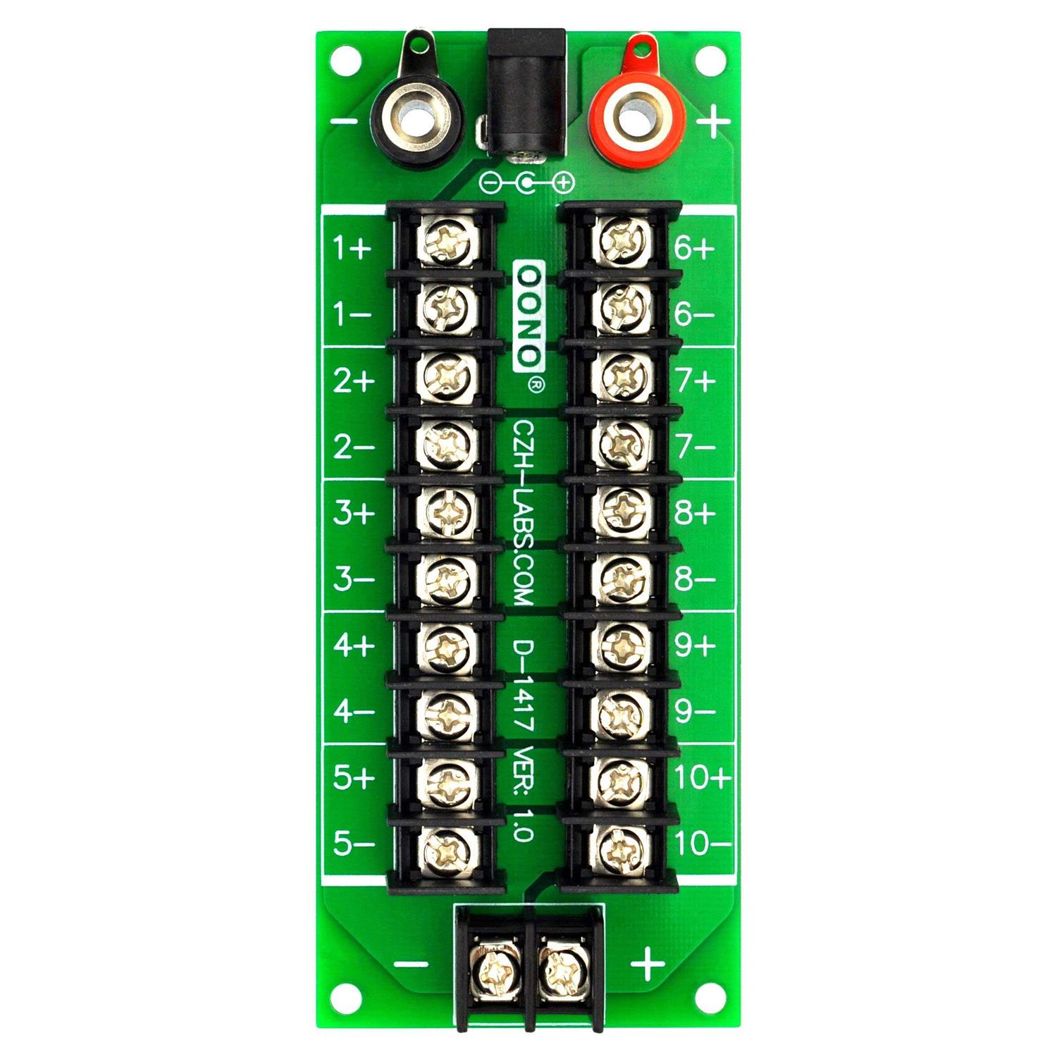 Terminal Blocks by OONO. Details:1, 20 Amp 48V 2×10 Position Barrier Terminal Block Distribution Module for AC DC. You can chose input from Barrier terminal block, Banana jack or DC power jack. Support for multiple module extension connections. 2, Rated current 20 Amp(input from barrier terminal block). Input from banana jack maximum current 6 Amp. Input from DC power jack maximum current 5 Amp. Maximum voltage 48V DC or AC. 3, Barrier terminal blocks: pitch 7.62mm, screw Metric M3(thread diameter 3mm). Banana jacks: standard 4mm jack. DC power jack: for 5.5mm x 2.1mm plug. 4, FR-4 glass fiber PCB. 5, Packing list: 1x Terminal block distribution module. 1x Red banana plug. 1x Black banana plug. 11x Red spade terminal connectors (support wire 0.5 to 1.5mm square). 11x Black spade terminal connectors (support wire 0.5 to 1.5mm square). 4x Black nylon spacers. 4x 3mm x 16mm metal screws.