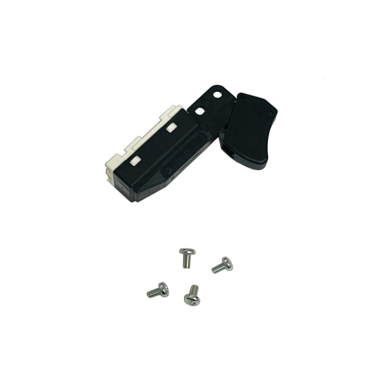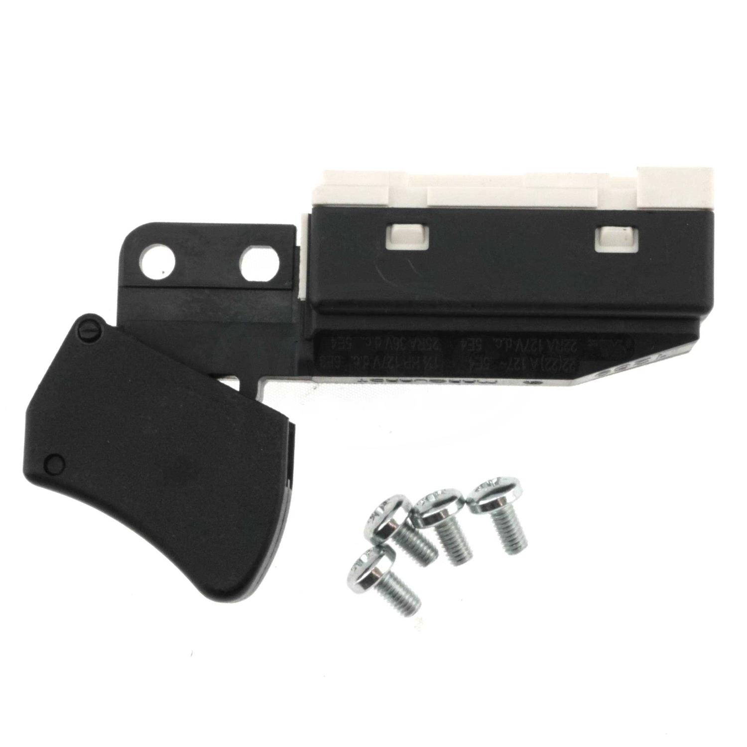 This is an on/off switch for various models of circular saws. This switch is located near the main handle assembly of the saw and responsible for toggling the power to the saw. This switch is made of durable black plastic and features a single toggle that the user presses to turn the saw on. Over time and through extended use, this switch can wear out and fail, at which point it needs to be tested with a multimeter, and/or replaced. To remove this switch for testing and replacement, you will need to first disconnect it from power, and then disassemble one half of the main handle with a drill or screwdriver. Once the securing screws are removed, you can pull the plastic shell of the handle off to expose its internal components. Pull the switch out of the housing and remove the wires connected to it, noting their location for the future installation. With the switch removed, you can test it with a multimeter to see if it has continuity, and if it does not, it will need to be replaced. With the new switch in-hand, install the wires with a screwdriver, starting with the motor wires (usually black first, and then white) and then the cord wires. Now place the switch into the housing and make sure the switch and wires are all flush, before reassembling the handle and securing it together. This Switch is used in Circular Saws, and Saws.