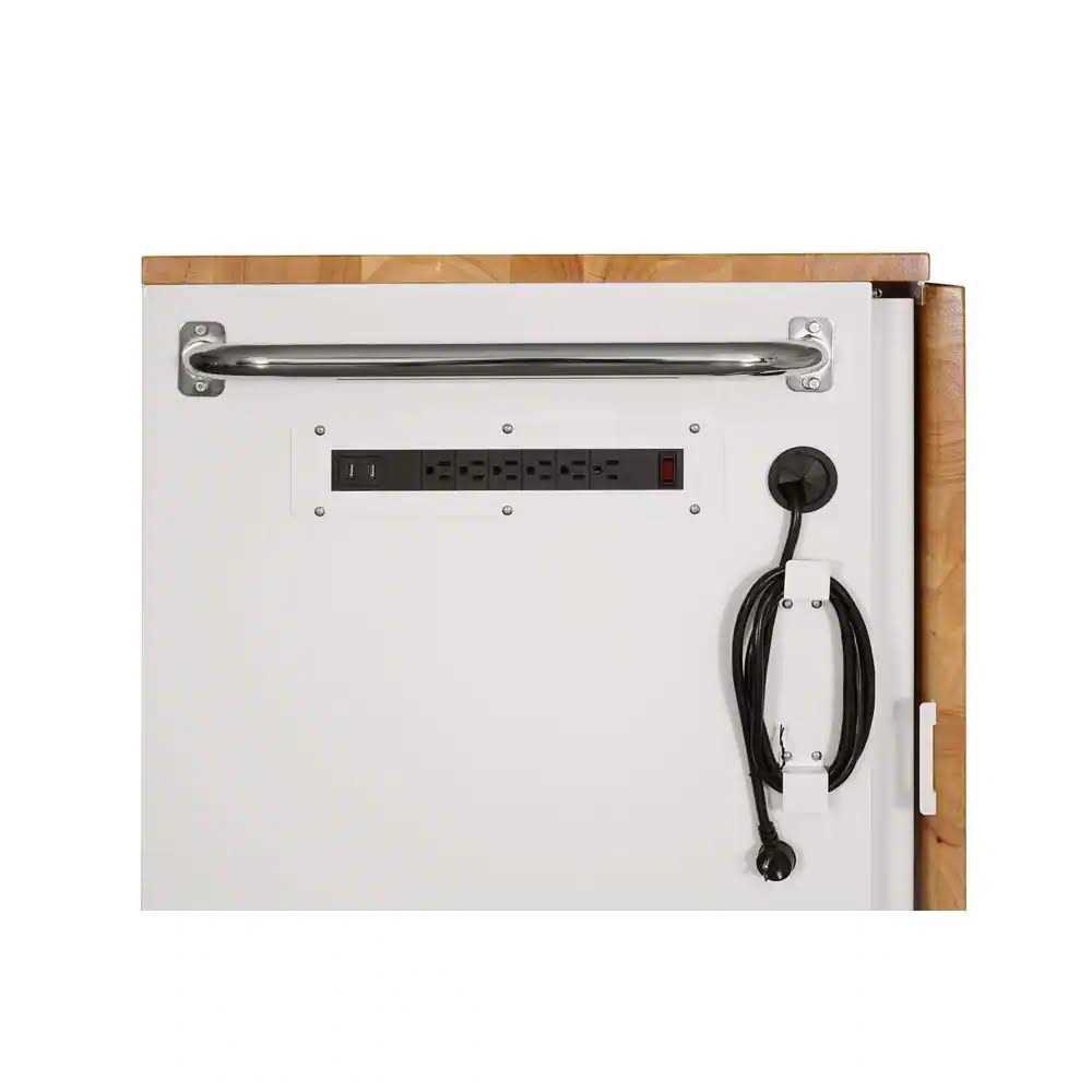 9-Drawer Mobile Workbench with fold up extended table provides a variety of options for your projects supports up to 1500 lbs. Measuring 24.5 in. D and offering an additional 26.4 in. D fold up wood top with fold out legs for a very large project center making the top 50.9 in. D when top is in use. This unit has 19,527 cu. in. of storage capacity and boast a solid wood top The full-width drawer easily accommodates longer items while 2, extra-deep bottom drawers are ideal for storing heavy, bulky items and are supported by 100 lbs. rated soft closing ball bearing slides. The large, aluminum drawer pulls are protected by end caps for safety and recess flush into the cabinet for a sleek look. For increased mobility, this workbench features a built-in power center with 6 outlets and 2 USB ports to charge power tools and devices. The large, 5 in. x 2 in. casters and steel tubular side handle allow for easy movement to different areas. Drawer liners included to secure items in place.