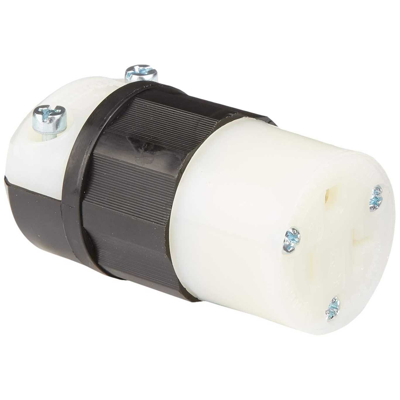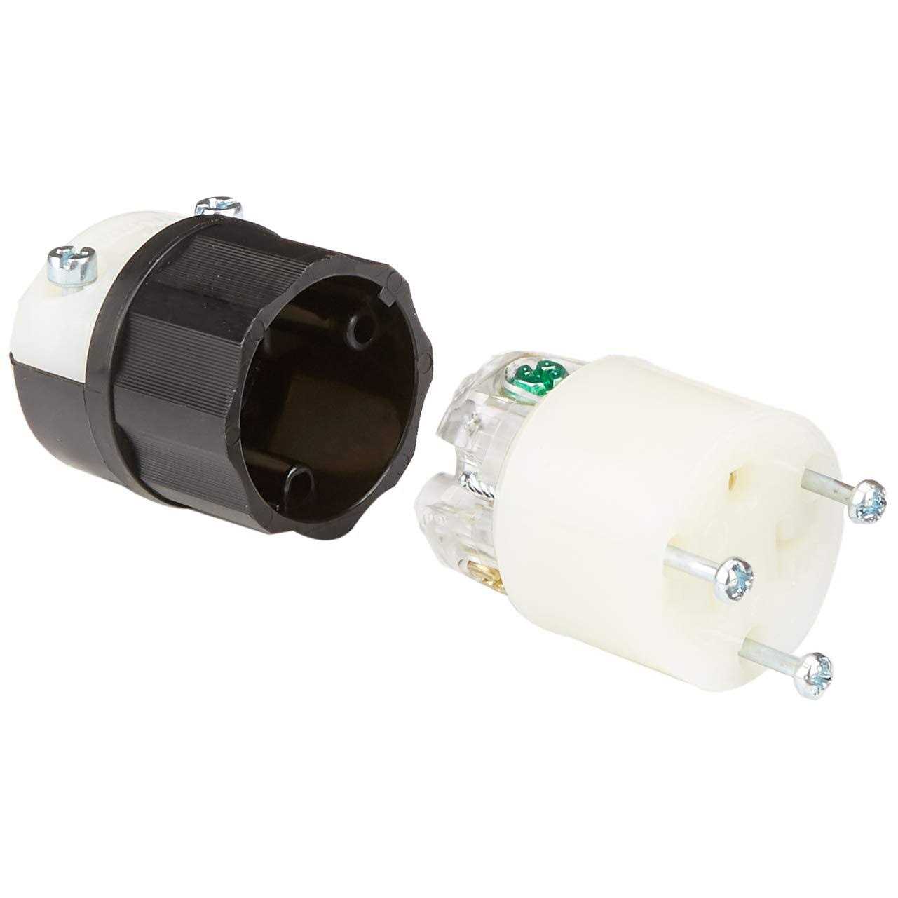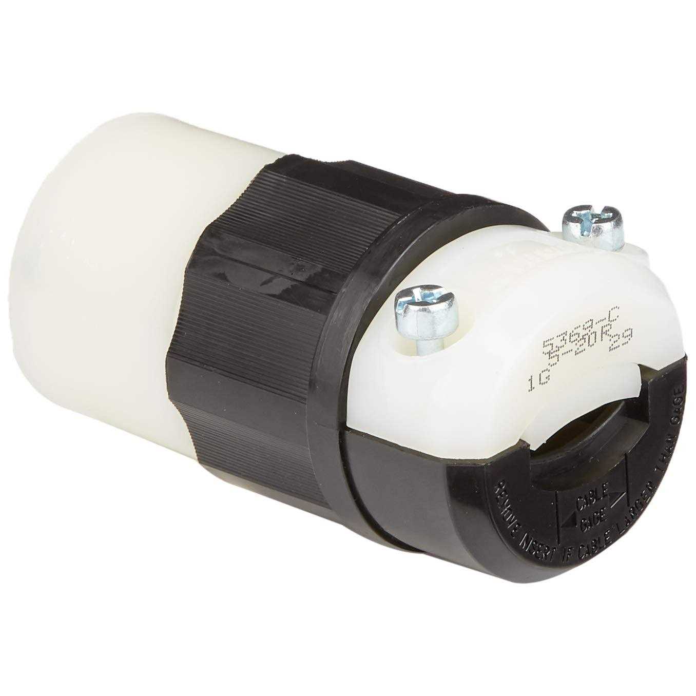 Leviton Black & White 2-Pole Grounding polarized straight blade connector in black/white color is made of impact-modified nylon with a thermoplastic back cover for durability. It has wire module, cord-clamp, clamp insert made of nylon that is a good shock absorbent. Connector has three-wire circuitry. Connector has voltage rating of 125 Volts, current rating of 20 Amps and can withstand 2000 Volts dielectric voltage. It measures 1.49 Inch bottom diameter x 1.39 Inch top diameter x 2.76 Inch. It withstands temperature of -40 to 60 deg C. Connector has blades/contacts and terminal screws made of solid brass for superior conductivity. It has assembly screws made of zinc-plated steel that offers rust free surface. It has NEMA rating of 5-20R. It has UL94 HB flammability rated to withstand hazardous environmental conditions. Connector is UL listed and is CSA/ANSI/NOM certified.