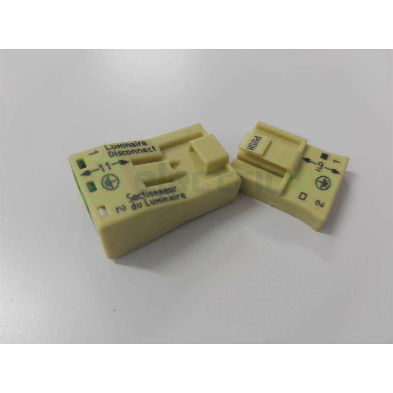 3-pole luminaire disconnect connector with conductor cross-section of 4,00 mm² in color yellow. – Important technical data – Rated voltage (II / 2): 400 VRated impulse voltage (II / 2): 4 k – VRated current: 6 AConnection technology: PUSH WIRE Type of actuation: Push-in – Connectable conductor materials: Copper – Solid conductor max. mm²: 4Solid conductor max. AWG: 12Solid conductor min. mm²: 0.75Solid conductor min. AWG: 16Stranded conductor max. mm²: 2.5Stranded conductor max. AWG: 12Stranded conductor min. mm²: 1.5Stranded conductor min. AWG: 16Stripping length (from 1 mm): 11Stripping length (up to 1 mm): 13Total number of terminal points: 9Total number of potentials: 3Width mm: 19Height mm: 13.2Depth mm: 42
