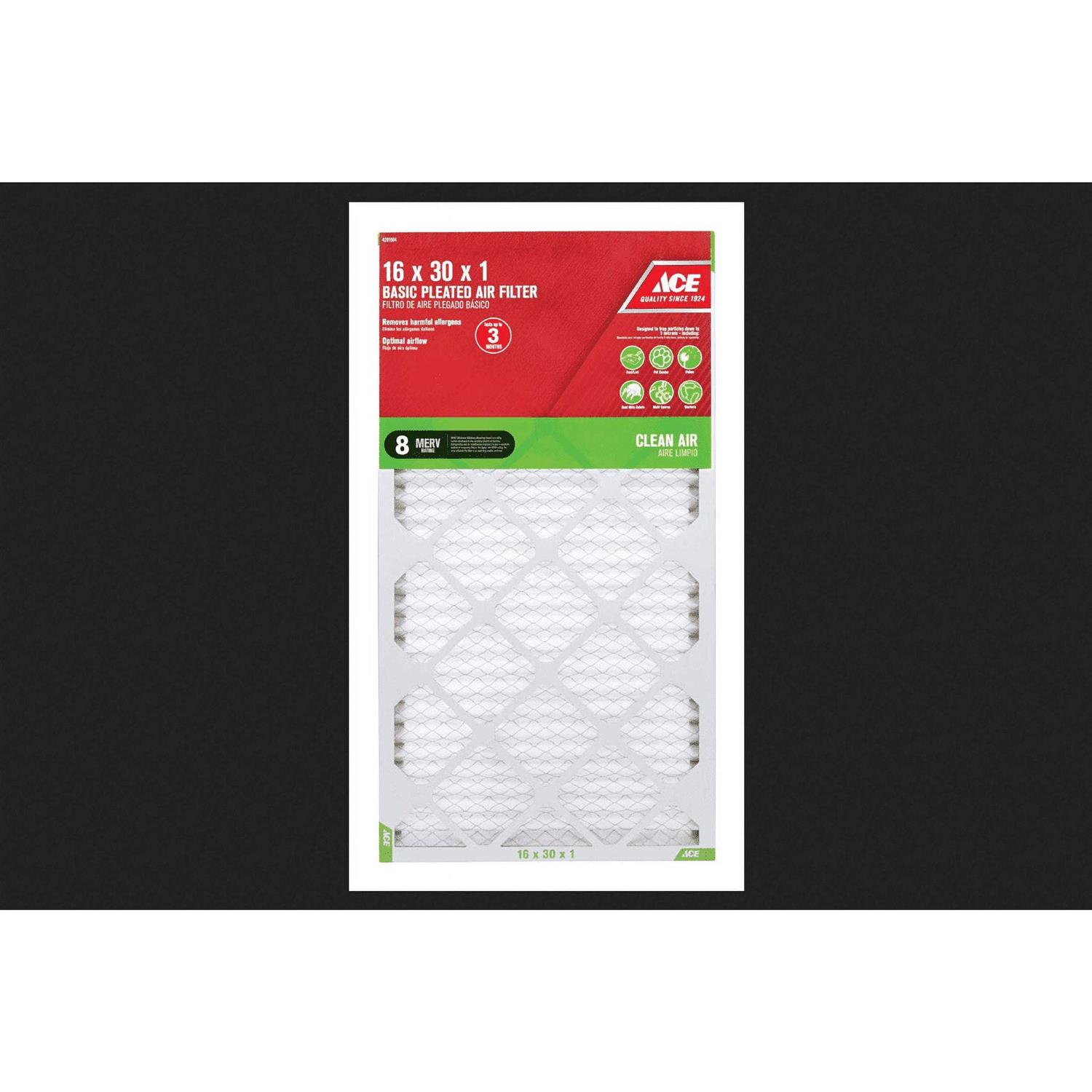 The Ace Clean Air Pleated air filter is made of a wire-backed pleated media. This filter provides up to 90 days of protection against many airborne particles. Convenient and easy to replace which makes it a great first step to improving your indoor air quality. The Ace Clean Air is effective against the following contaminants: dust and lint, dust mite debris, pollen, pet dander, mold spores and bacteria. UL Classified.Brand Name: Ace Width: 16 in.