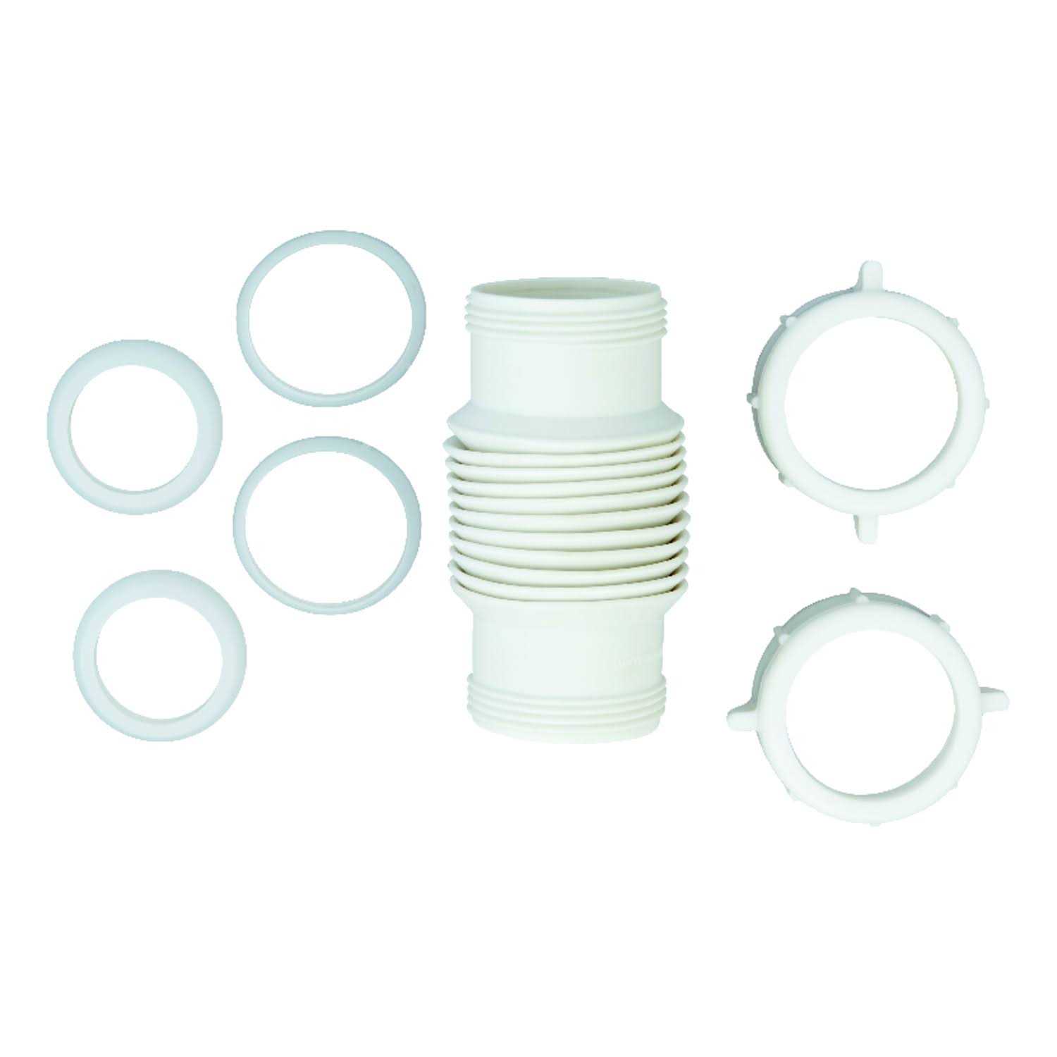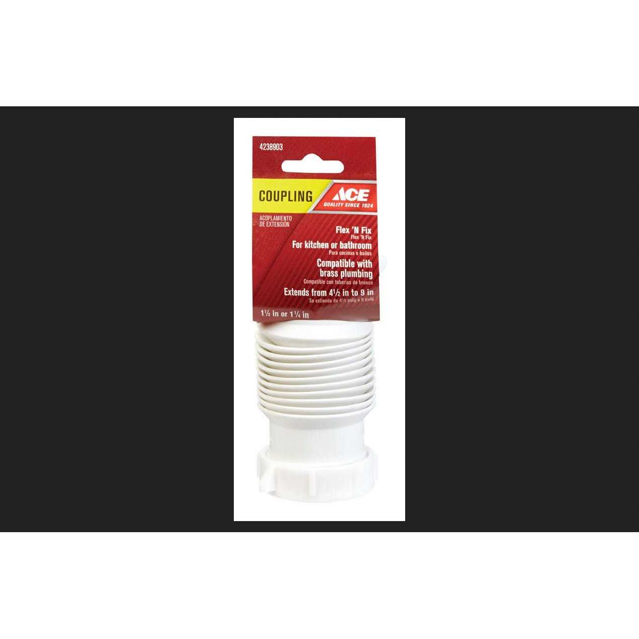 The flex’n fix double slip joint repair coupling dimensions are 1 1/2″ or 1 1/4″ and is 6″ long. This repair part can be used in the kitchen or bathroom. The part can be re-positioned for unaligned plumbing connections. Includes all necessary nuts and washers. White polypropylene