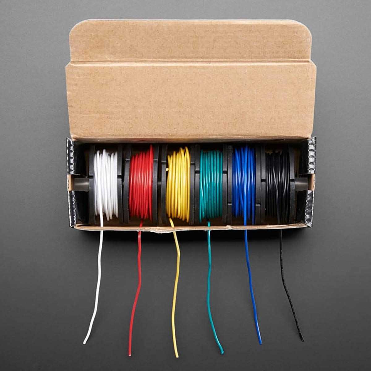 Key Features: Perfect for bread-boarding or free wiring 6 spools of 22AWG solid-core wire Fits in terminal blocks nicely Six different colors of wire: white, red, yellow, green, blue, black Perfect for bread-boarding, free wiring, etc. This box contains 6 spools of solid-core wire. The wire is easy to solder to and when bent it keeps its shape pretty well. Item Specifics Box