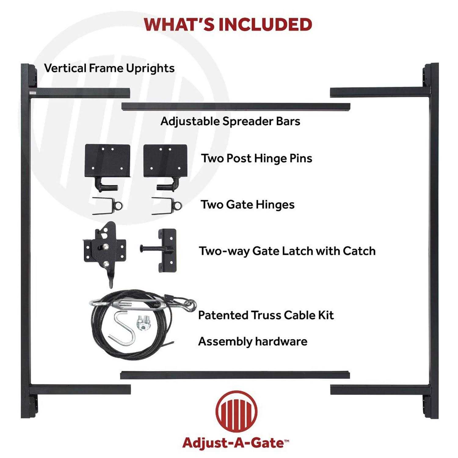 Build a new gate that never sags or drags and has a perfect fit every time or repair an old existing gate. This gate brace frame kit is built with contractor grade steel, with rust-resistant coating for durability. Includes an adjustable frame, lockable two-way gate latch, post hinges and gate hinges and patented truss cable system. Just add wood or composite to match your fence. Built on-site to fit your gate opening perfectly, works for wood or composite fencing, 2 rail or privacy fence. Contractor quality and DIY friendly with comprehensive easy to understand illustrated instructions included.