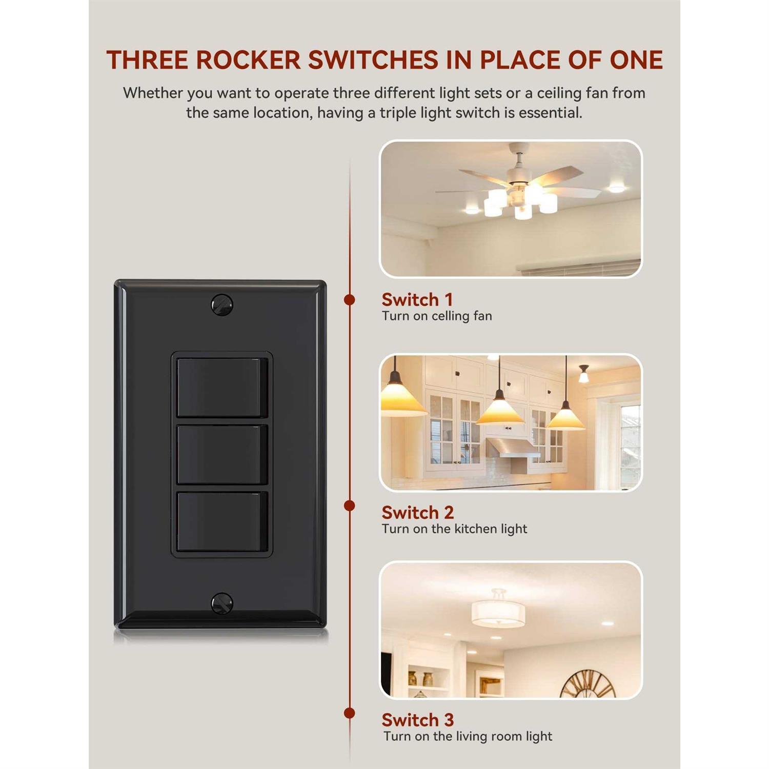 【Three combinated Single Pole Switch】AIDA triple paddle rocker Switch allows to control up to 3 fixtures from one location. Ideal for use in residential and most commercial where space in the electrical wall box is limited. 【Self-Grounding】It can be automatically connected to a well-grounded metal wall junction box. 【High Quality】Decorator rocker switch is made of impact-resistant polycarbonate thermoplastic and solid steel, which is beautiful and durable. 【Easy Installation】Provide both back wiring and side wiring. Shallow back body leaves more space for wires in the box. 【Universal Application】Wall switch suitable for residential use and most commercial areas that require only 15Amp switches.