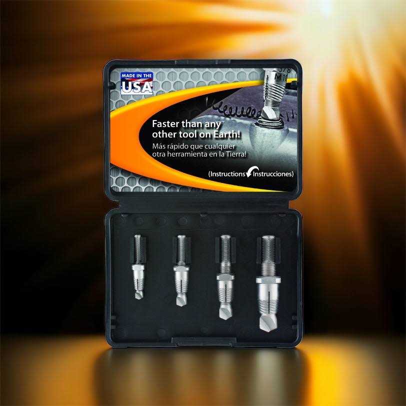 Drill-out is a drill-bit and extractor in one tool. It drills into broken bolts on center and extracts them cleanly using the power of the drill. The secret is in the serrated extracting end of the tool which drills down and wedges itself into the bolt, resulting in greater torque for hard to remove bolts. Simply chuck the self-centering bit, set your drill to reverse, and drill at medium speed to extract the bolt.