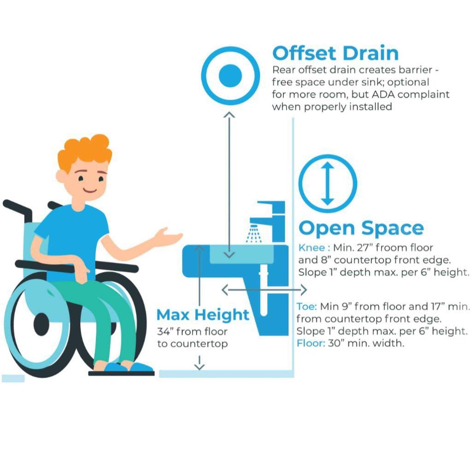 This ADA-compliant under mount sink compliments the needs of any handicapped bathroom. The ADA-1218 is designed specifically for ADA-style cabinets. The depth of the sink is shorter than standard models for ease of ADA-installation and is recommended to meet needs of any handicap bathroom.