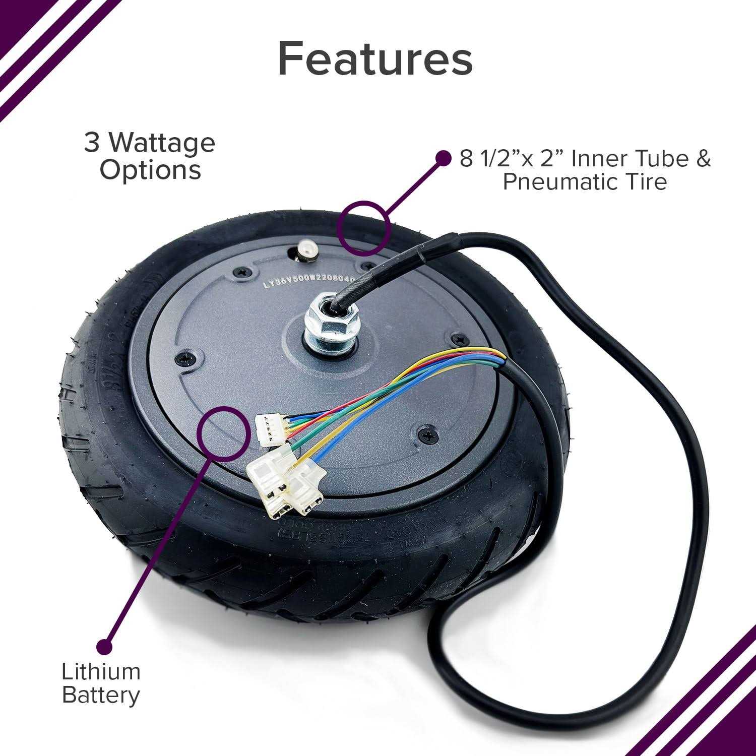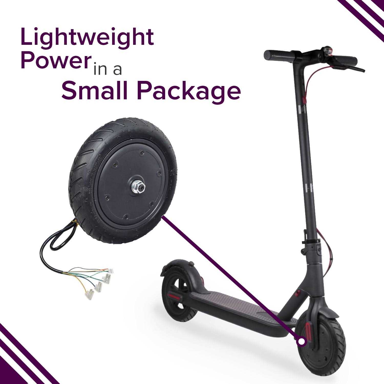 If you need a replacement hub motor and front wheel assembly for the Xiaomi Mi M365 electric scooter you have found the right page. This hub motor is made in three wattage versions, 250W, 350W, and 500W. Dimensionally all three hub motor/front wheel assemblies are identical, and all three wattage options sport an 8-1/2 inchx2 inch inner tube and pneumatic tire with a low-siped street tread perfect for the city pavement. The hub motor/wheel assembly is an old idea that is enjoying a new renaissance of popularity. Without a separate rim or other superfluous parts, these hub motor/drive wheel units allow a lightweight power in a small package. Combined with 21st century Lithium battery technology, the hub motor system has revolutionized the realm of electric scooters.Note: These may also be compatible with M365 clones such as the rental scooters used by Bird, Lyft, Spin, and others. Specifications Voltage: 36V Wattage: 250W, 350W, 500W Weight: 6.9 lbs. Tire: 8-1/2 inchx2 inch pneumatic