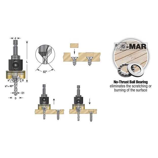 Amana Tool – 55229 Carbide Tipped 82 Countersink with Adjustable Depth Stop & No-Features an adjustable. heavy-duty. revolving depth-stop with a strong Thrust ball bearing for Quick and easy adjustment of the countersink depth without scratching or burning surfaces. It also has an open space to allow for chip evacuation. The user friendly design enables control of the drill length and its replacement. without the need to disassemble the depth-stop. Enables users to drill a pilot hole and tapered Countersink in one step. The adjustable depth-stop and independent stop Collar prevent marking of the workpiece and perfect Countersink depth control. (A) angle 49. (B) Cutting height 3/64-3/8. (D) diameter 3/8. (D) shank 1/4. overall length (L) 2-5/8. drill DIN 1897. wood screw size 8.