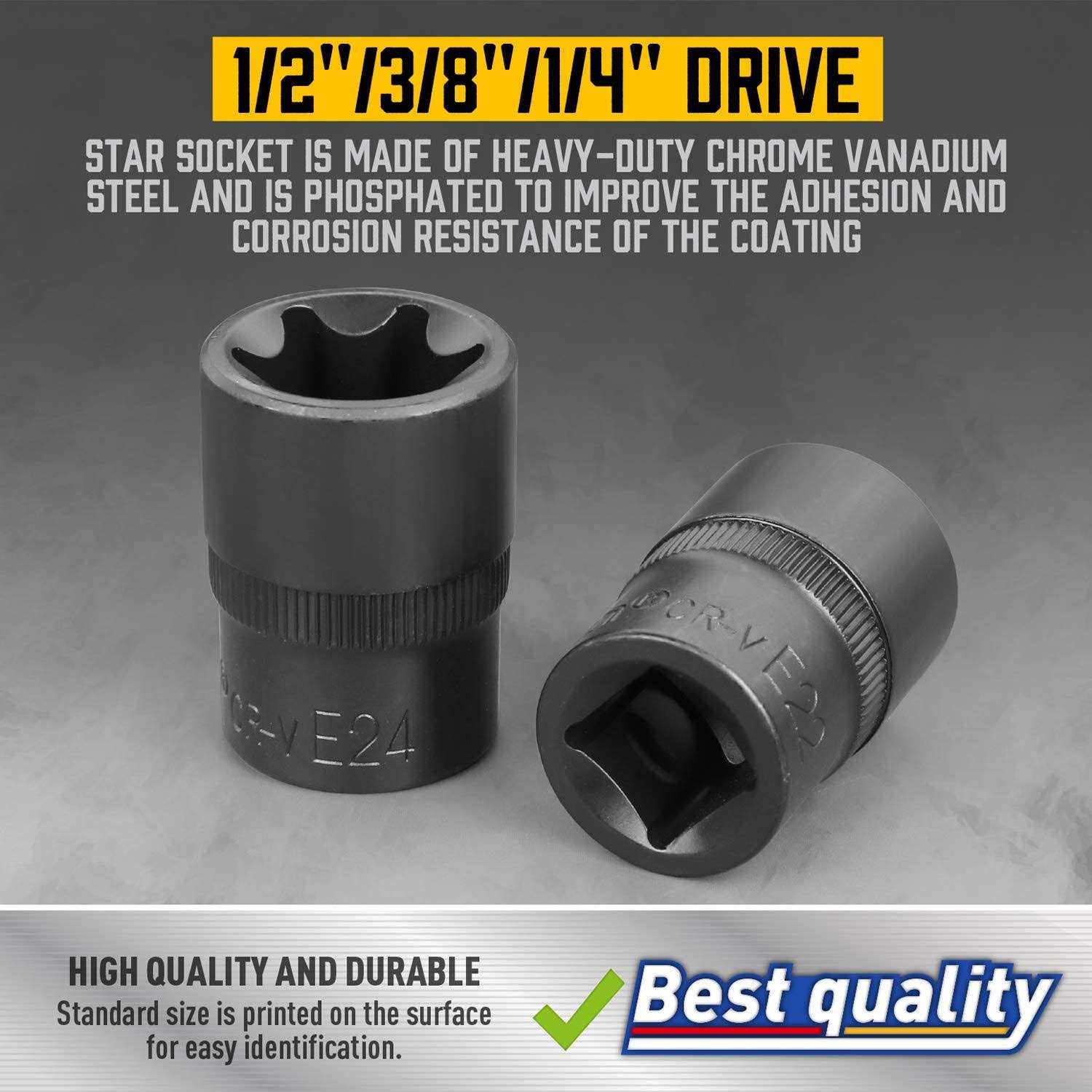Brand: Amartisan Color: Black Features: [HIGH QUALITY AND DURABLE] :Star socket is made of heavy-duty chrome vanadium steel and is phosphated to improve the adhesion and corrosion resistance of the coating. Standard size is printed on the surface for easy identification. [WIDE RANGE OF USES] :E-Torx socket set can meet your work needs. It is an essential tool for your car, motorcycle, bicycle, lawn equipment, electrical appliances, machinery, etc. [EASY TO STORE] :Equipped with a dedicated storage box, and each position is marked with dimensions for easy storage. Binding: Tools & Home Improvement model number: AM9837 Part Number: AM9837 Details: [HIGH QUALITY AND DURABLE] :Star socket is made of heavy-duty chrome vanadium steel and is phosphated to improve the adhesion and corrosion resistance of the coating. Standard size is printed on the surface for easy identification. [WIDE RANGE OF USES] :E-Torx socket set can meet your work needs. It is an essential tool for your car, motorcycle, bicycle, lawn equipment, electrical appliances, machinery, etc. [EASY TO STORE] :Equipped with a dedicated storage box, and each position is marked with dimensions for easy storage. EAN: 0738596446338 Package Dimensions: 5.1 x 4.6 x 2.2 inches