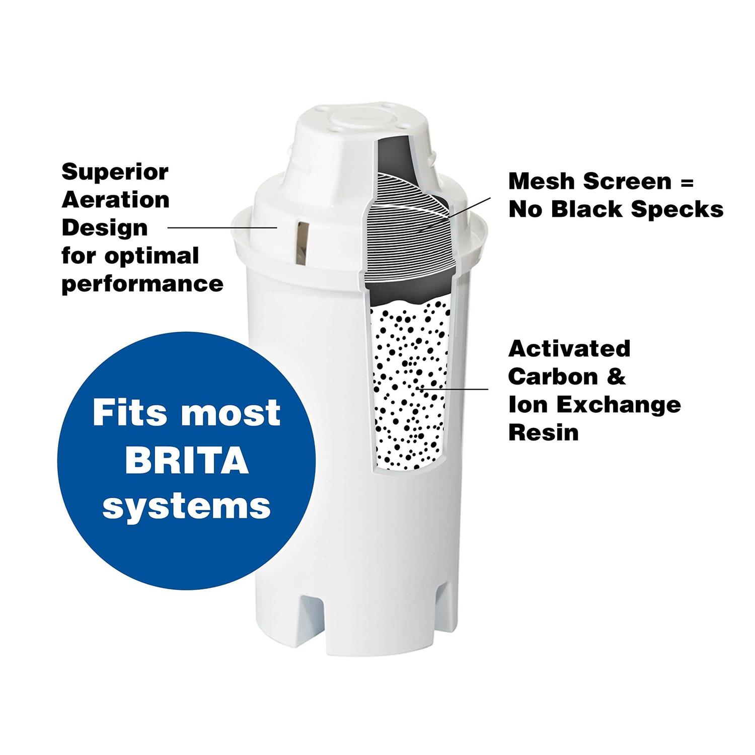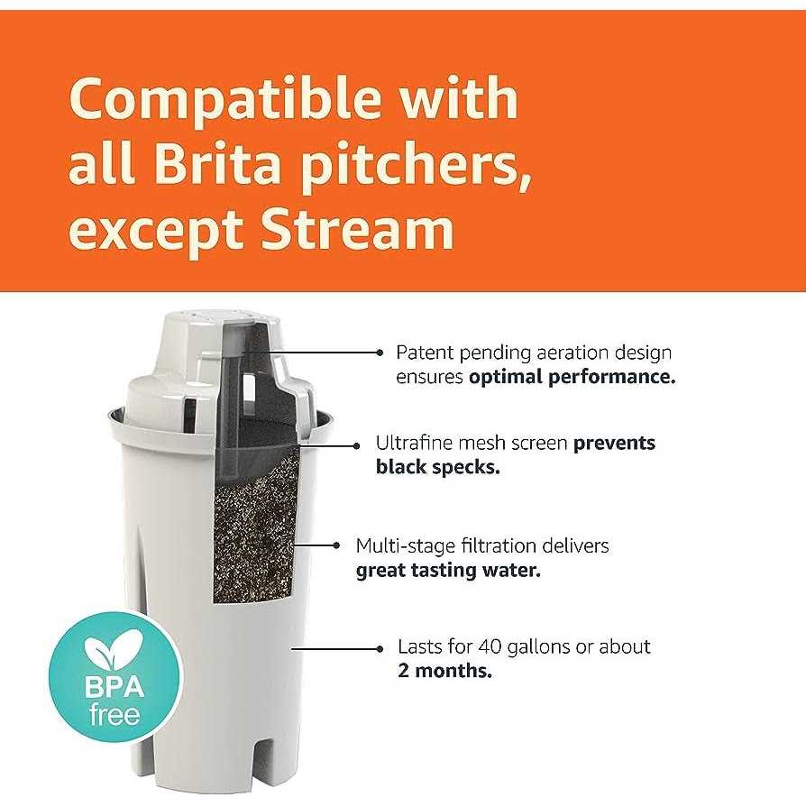 COMPATIBILITY: Replacement water filters for Amazon Basics and all Brita pitchers and dispensers except Brita Stream. TASTE: Multi stage filtration technology ensures consistently fresh, great tasting water. One filter lasts for 40 gallons or about 2 months for the average household. WQA CERTIFIED: Gold seal certified by the Water Quality Association against NSF/ANSI 42, 53 and 372. Certified to reduce chlorine taste and odor, copper, mercury and benzene. Made from lead free materials. BPA free. REDUCE WASTE & SAVE: One Amazon Basics water filter replaces 300 single use plastic water bottles. Stay hydrated, save money and reduce plastic waste. ORIGIN: Designed and Made in Europe.
