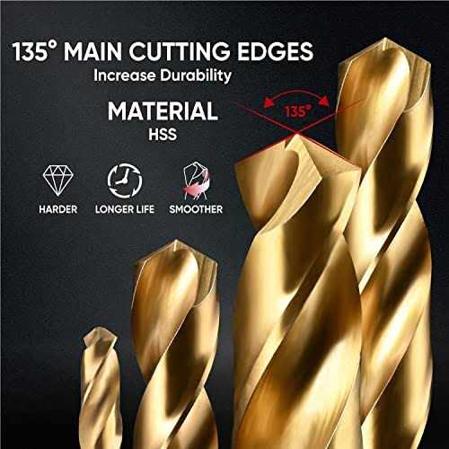 【10Pcs 5/32″ HEX DRILL BITS】10Pcs – Diameter:1-11/16”(43mm) x Flute Length:1-11/16”(43mm) Metal Drill Bits. Come with a portable plastic case for easy select, storage and carry; 【ADVANCED HSS TITANIUM COATING】Industrial grade 4341 high speed steel drill bits set, harder than 4241 HSS and has stronger cutting capacity. Titanium coating increases wear-resistance and durability; 【FULLY GROUND PROCESS & 135° SPLIT POINT】Fully ground spiral flute discharge scraps quickly, reduce friction and heat, therefore provides a faster, cooler and more efficient drilling performance; 135° Split Point with straight shank prevents slippage and makes drilling stable and precise. No center punch is needed; 【QUICK CHANGE】5/32″(4.0mm) hex shank base well fits into majority pistol drill and drill press, more easily and securely installation without slippage and shedding; 【MULTIPLE APPLICATION】Small Drill bits for wood, plastic, steel plate ≤ 5mm, aluminum alloy and other soft metals. Ideal choice for DIY projects, household maintenance and repair NOT for glass, ceramic or concrete drilling. amoolo 5/32 Impact Drill Bits Set, 10Pcs Titanium HSS Twist Hex Shank Drill Bit Set for Metal, Steel, Wood, Plastic, Quick Change Design