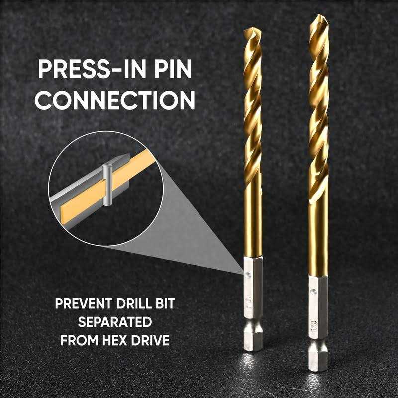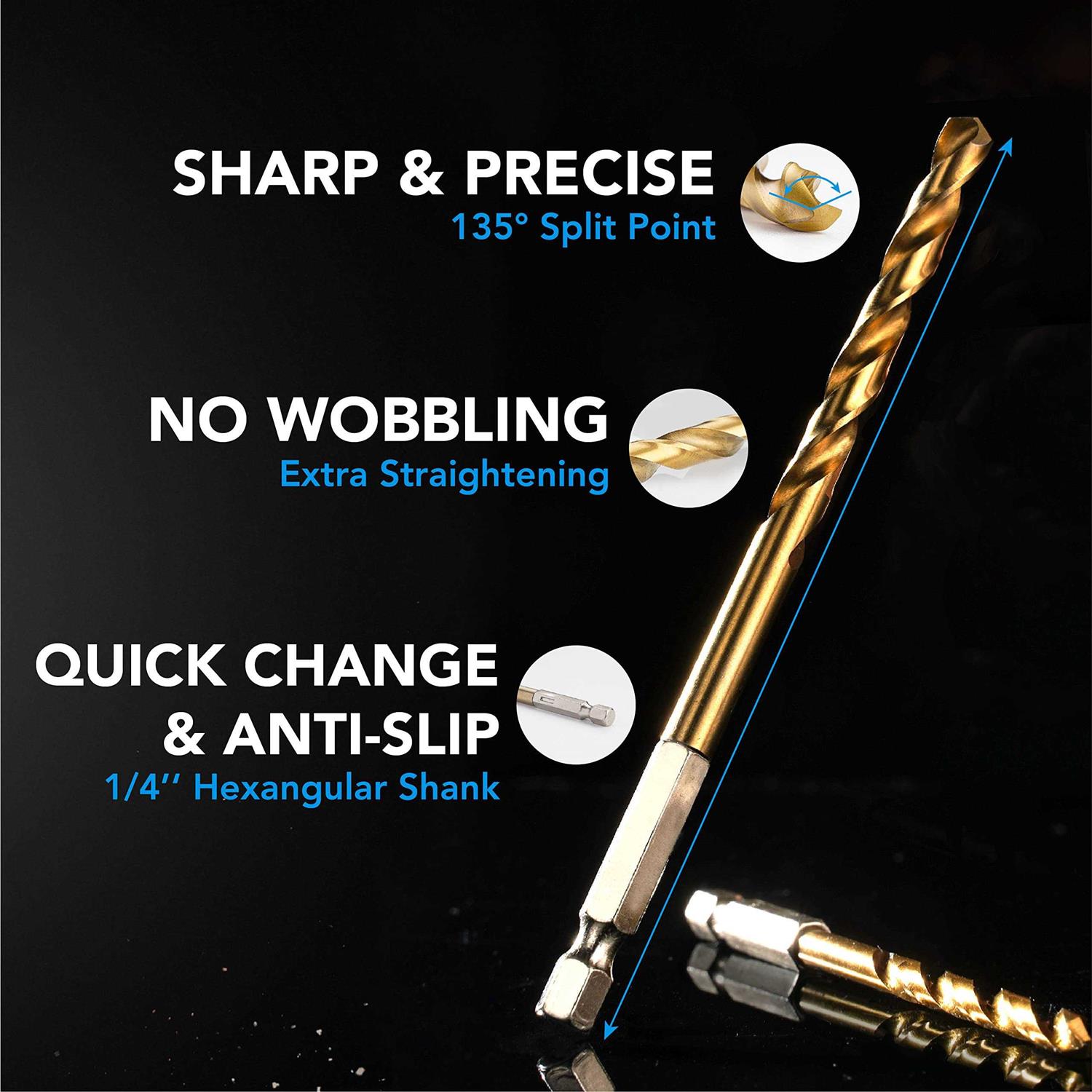 Comes with a portable plastic bag with size index for handy pick, storage and carry. 【PREMIUM HSS TITANIUM COATING】Industry grade 4341 high speed steel drill bit set, harder than 4241 HSS used in other similar drill bits set. Titanium coating increases wear-resistance and durability. 【FULLY GROUND PROCESS & 135° SPLIT POINT】Fully ground spiral groove design clears particles quickly, decreases friction and heat for a faster and cooler drilling performance. 135° Split Point with straight shank prevents walking and makes drilling precise. No center punch is needed. 【QUICK CHANGE】1/4″(6.4mm) hex shank fits into majority pistol drill and drill press, more easily and securely without slip and shedding. 【MULTIPLE APPLICATION】Small Drill bits for soft metal, wood, plastic, steel within 5mm thickness, aluminum alloy and other soft metals. Ideal for DIY projects, household maintenance and repair. ×NOT for glass, ceramic or concrete drilling.