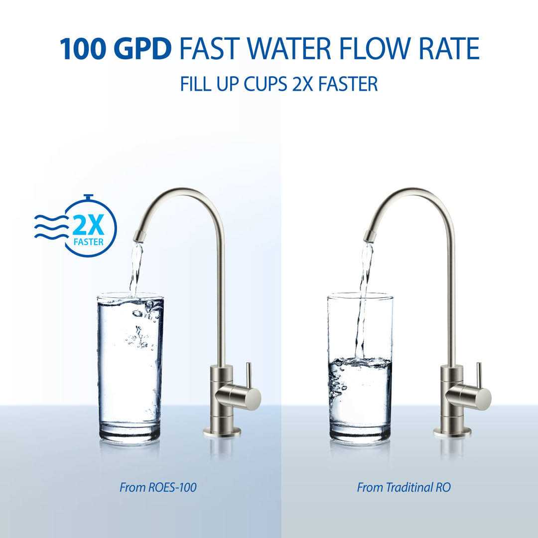 Enjoy unlimited ultra-fresh, healthy, great tasting drinking water straight from your kitchen tap for cooking and making delicious coffee, tea & ice. Save money, time, and hassle of buying costly, bottled water and live healthier with ultra-safe water that is contaminant free. The ROES-100 reverse osmosis system produces high quality clean filtered drinking water at twice the speed and the 3/8 Fast-Flow output design increases the flow rate of water from your tank to faucet. It offers exceptional contaminant rejection rates of up to 99% to provide you the purest water possible. Lastly, safeguard your cabinet from expensive water damage with the water leak detector to give you a peace of mind for unexpected issues under your sink.