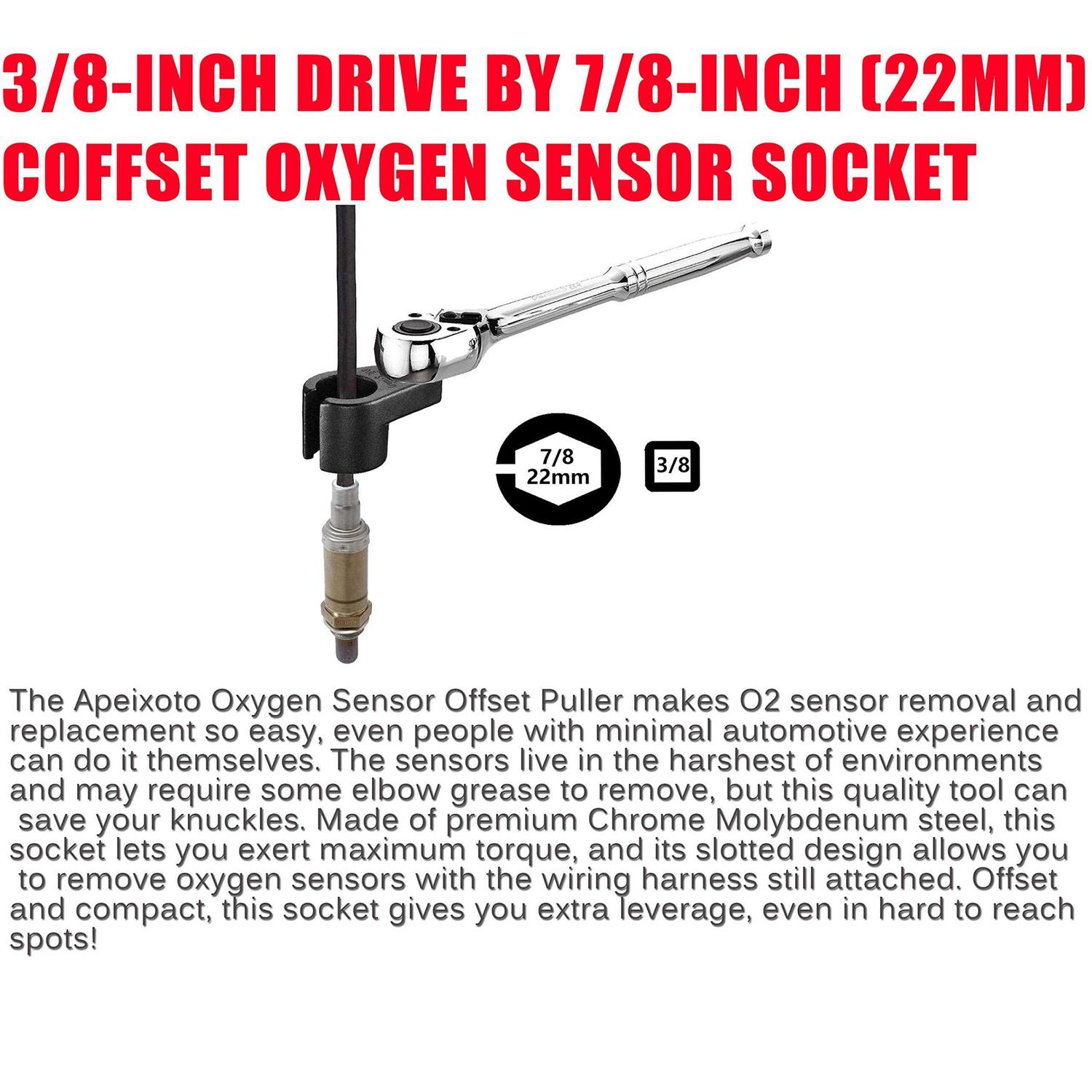 AP1822F 3/8-inch Drive by 7/8-inch (22mm) Offset Oxygen Sensor Socket High-performance chrome molybdenum steel construction Wire Gate Accesses Sensor from The Side, Preventing Damage to Wires Our sales are not products, but quality. This tool meets and exceeds ANSI/ASME standards. Apeixoto offers a full line of Oxygen Sensor tools including our complete AP1822F Oxygen Sensor Socket set that features thread chasers, oxygen sensor sockets and more! Read more Actuator Locations on Chevy & GMC Trucks & SUVs FEATURES:Removes and installs oxygen sensors on vehicles with computer-controlled engines,Common 6 point, 7/8 in. (22mm) socket fits most oxygen sensors,Use with any 3/8 inch drive ratchet or breaker bar,Offset drive with wire gate accesses sensor from the side, not the top, preventing damage to wires Read more Installation If you need help installing, please read instruction. United States Station I hope that our cooperation will allow you to get fast products. Read more Product Features DESIGN: Our socket’s slotted design allows you to remove oxygen sensors with the wiring harness still attached, and the socket is offset and compact which allows extra leverage even in hard to reach spots QUALITY:This socket made from premium Chrome Molybdenum steel, the socket allows users to exert maximum torque while the precision casting ensures accurate fit and function. This tool meets and exceeds ANSI/ASME standards. Apeixoto offers a full line of Oxygen Sensor tools including our complete AP1822F Oxygen Sensor Socket set that features thread chasers, oxygen sensor sockets and more! FUNCTION: Even if you don’t have a lot of experience working with cars, you can replace your O2 sensor with this tool to help with your car’s emissions and gas mileage. The sensors live in the harshest of environments and may require some elbow grease to remove, but this quality tool can save your knuckles and save you time!