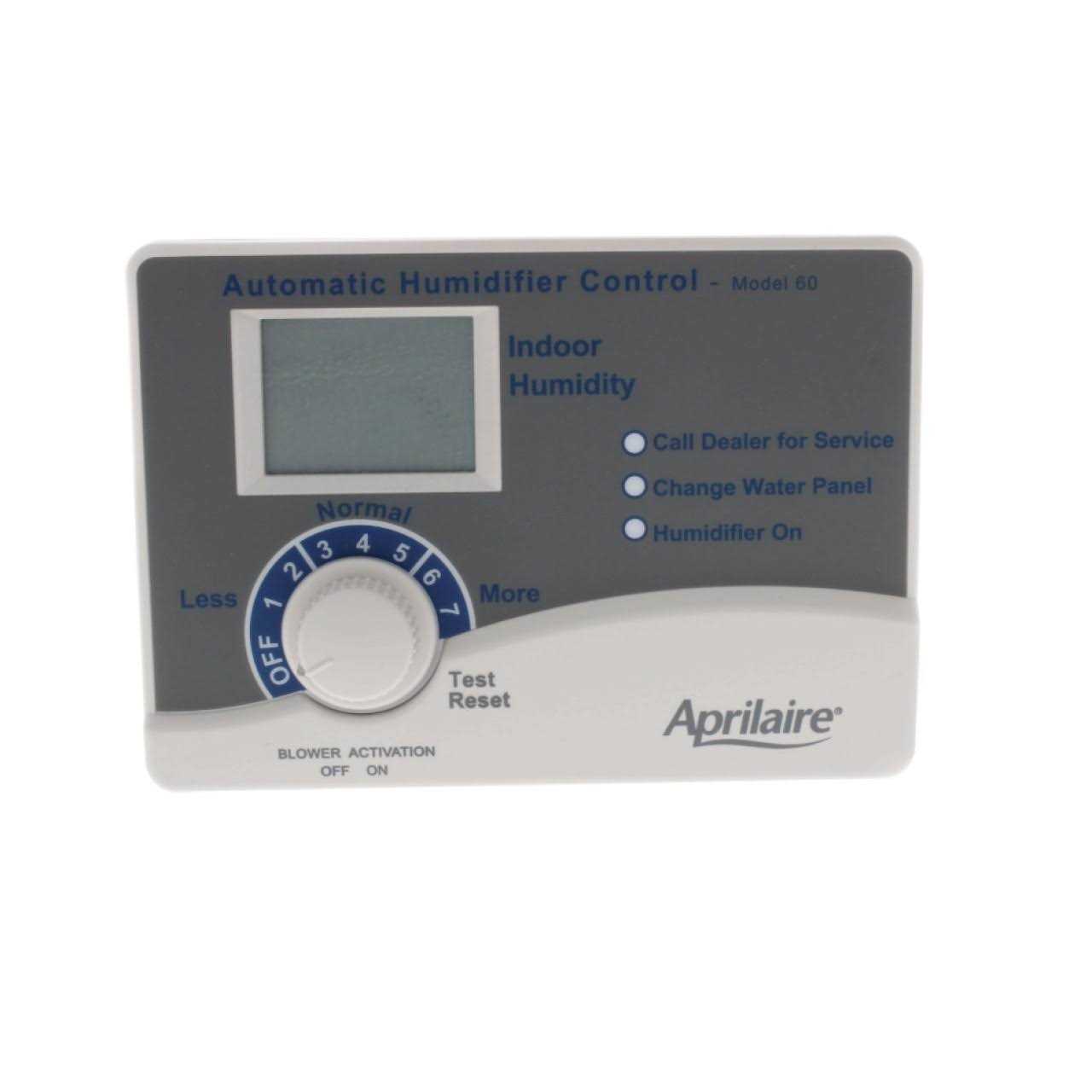 The new Aprilaire #60 automatic humidifier control works in conjunction with your furnace to control the operation of the humidifier. The control senses indoor RH and outdoor temperature and automatically adjusts the operation time of the humidifier to provide the optimum humidity level in the home. The digitial readout on the control displays the RH level inside the cold air return. This humidistat can also be used in manual mode when it is not possible to run wire to outdoor sensor. – New lighted display includes indoor relative humidity readout, service indicator light, water panel change light, and “on” indicator light. Shows that the humidifier is operating – Allows you to check relative humidity level – Tells you when it’s time to change the water panel – Gives you service alerts – Used on Aprilaire Humidifier Models 400, 500, 600 and 700Controls humidity