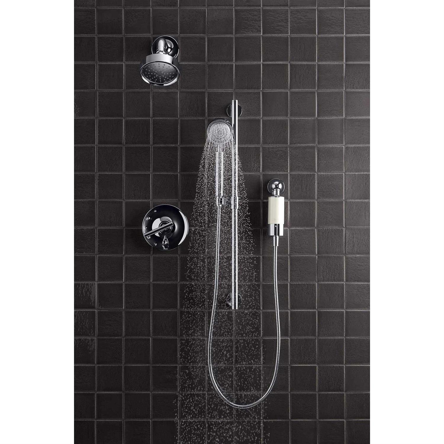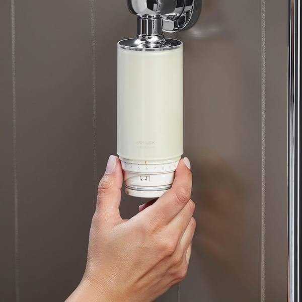 Designed to work with handshowers to reduce chlorine and odor in water. Reduces chlorine and odor controls scale and inhibits the growth of bacteria and algae. Reduces skin dryness and irritation and is gentle on your hair. Easily attaches to most exposed shower valves handshower hoses and wall elbows. 4. 0 gallons per minute 15 liters per minute flow rate at 60 psi. Includes one K-30647 Aquifer filter cartridge. Filter media lasts up to 8000 gallons 30000 liters or 6 months. Recommended filter cartridge replacement every 6 months. Intuitive filter replacement indicator.