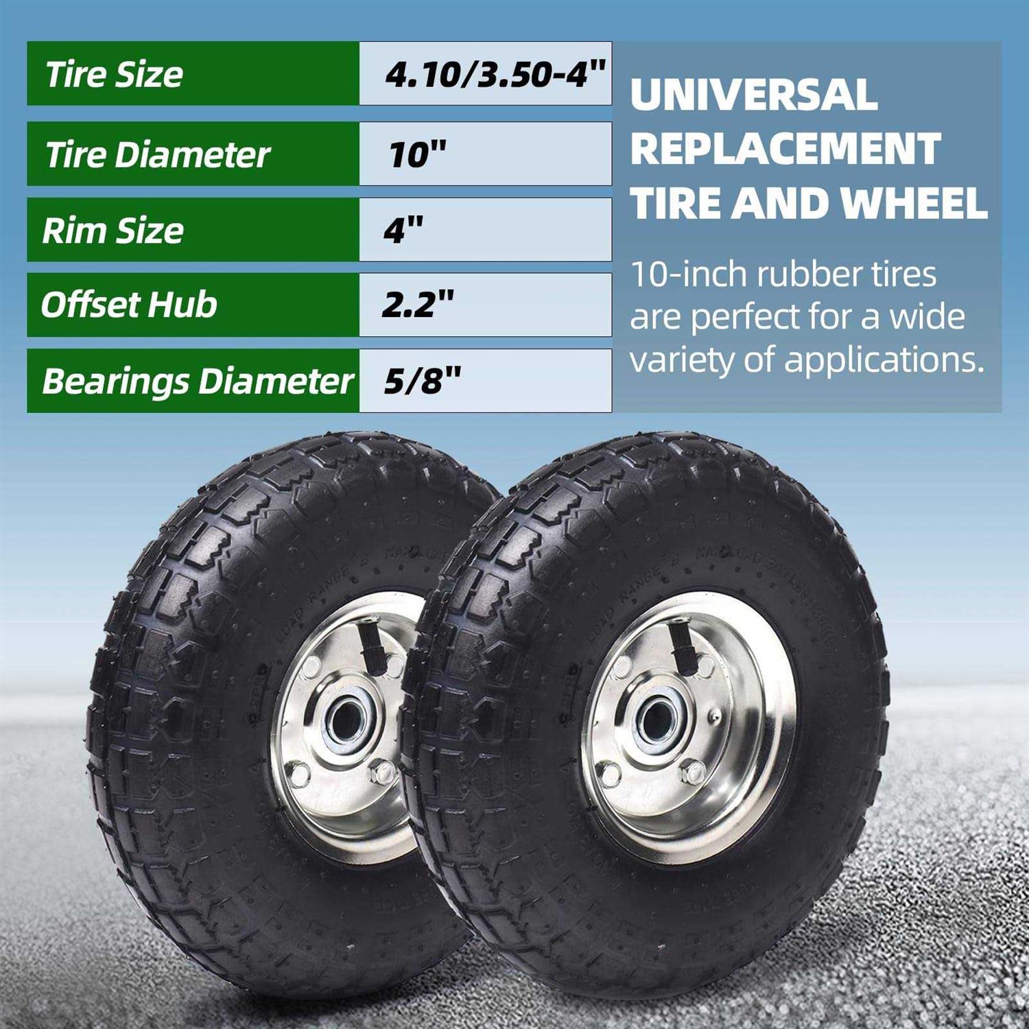 Tires by AR-PRO. Details:This tire and wheel set comes aired and ready to install. With a size of 4.10/3.50-4 inches, a tire diameter of 10.3 inches, a tire width of 3.3 inches, 1 3/4 inches offset hub, and 5/8 inches axle bore hole, these tires are one of the most common size and type of tires used on hand trucks, lawn mowers, and other wheeled equipment. Used for both home and commercial purposes, these wheels have a maximum load capacity of 300 pounds and a PSI of 30. And although these wheels are heavy-duty, they aren’t designed for use as driving wheels. Instead, they are suitable for free- rolling applications including rear (idle) wheels for lawn mowers, hand truck wheels, and trail-behind attachments. The treads are perfect for outdoor use. Sawtooth treads provide maximum traction without harming grass. It also lasts longer and with its jagged tracks, it provides a solid grip on different terrains including turf, paved paths, dirt, and sand. Use these wheels in any terrain…