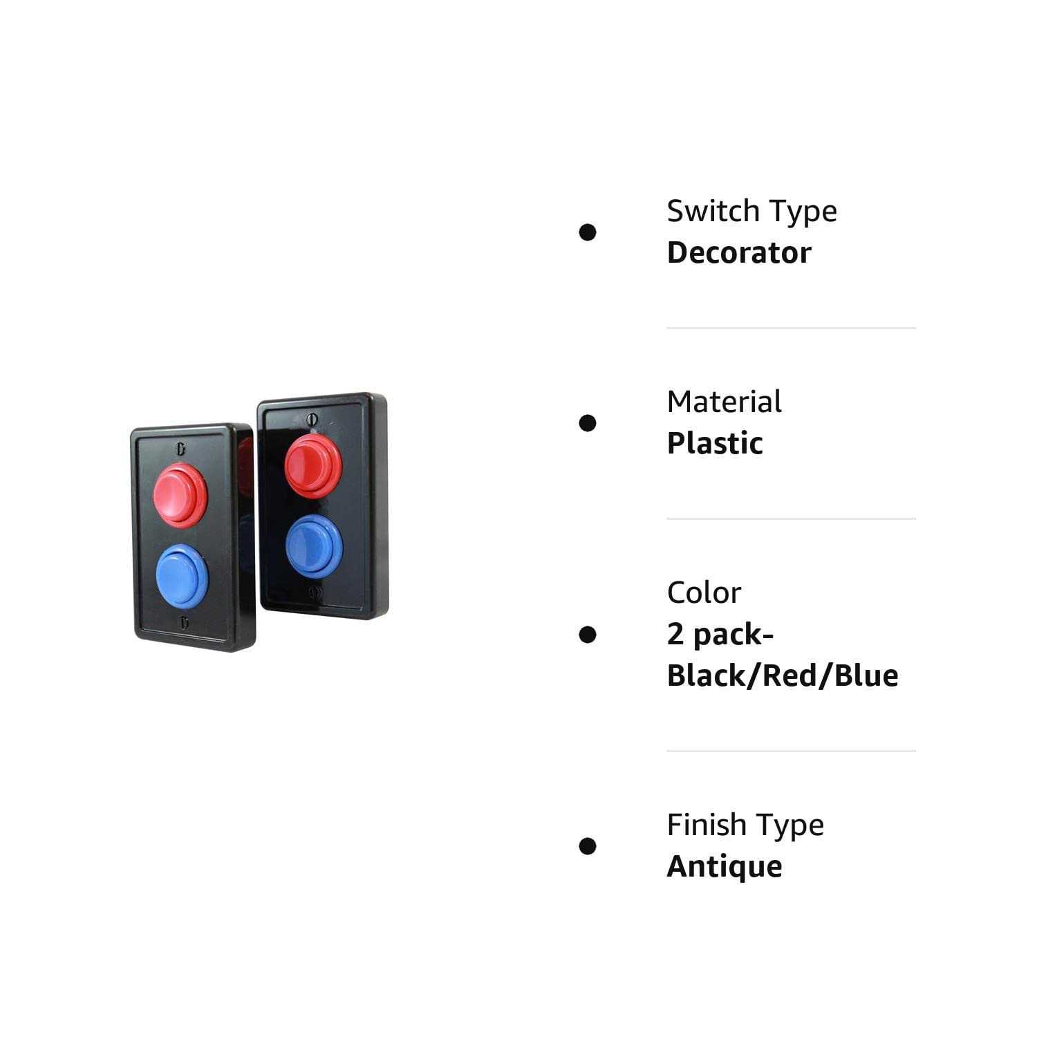 Nostalgic, Arcade Style Design Inspired by classic arcade style games, these replacement faceplates will take any video game room, bedroom, or playroom to the next level. Amp up your design with these all-plastic light switch covers. They have a smooth feel, with a satisfying click each time you turn the light on or off. Requires a Rocker-style Light Switch Arcade Plates can be installed over any standard, rocker-style light switches (also referred to as paddle-style light switches). See the reference photo if you’re unsure what type of light switch that is. If you don’t currently have rocker-style switches, they are inexpensive at any hardware store, and can be easily installed-No hardware is included to install rocker-style light switches; Arcade Plates are simply light switch covers, not actual switches. Easy to Install Install Arcade Plates without ever touching the wiring! All you need to install Arcade Plates is a standard flathead screwdriver. Simply remove the existing faceplate, and replace it with the Arcade Plate using the included screws, which match the color of the faceplate. Instructions are included with every purchase. Easy to Clean Smooth, glossy finish makes cleaning the switches quick and easy. Customizable, Inter-changeable Design All Arcade Plates are designed to be interchangeable with each other. Customize your look however you want by selecting the appropriate colors in the product options. Use Arcade Plates for boy’s rooms, girl’s rooms, game rooms, man caves, or any other themed room.