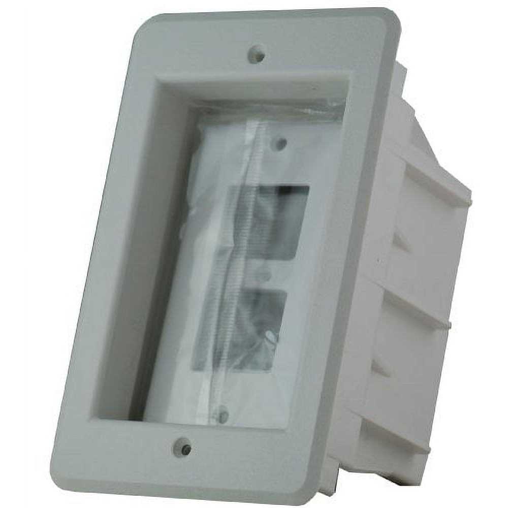 Arlingtons recessed non-metallic IN BOX for indoor use allows plasma and LCD TVs to mount flush against the wall. Great for furniture or countertop items like coffee makers or microwave ovens too. Its available in one- or two-gang styles in black and white for power or low voltage applications in new construction or old work. Using the supplied separator with the two-gang style allows you to install one power and one low-voltage device in the box.