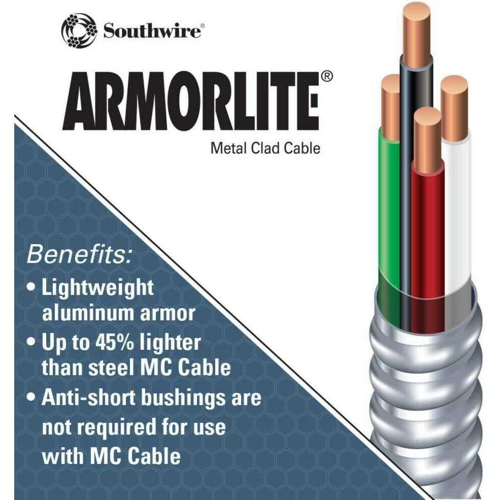 Southwire Armorlite Type MC Cable is constructed with soft-drawn copper, Type THHN/THWN conductors rated 90C dry available in sizes 14 AWG through 2 AWG, and a green insulated grounding conductor. The conductors are cabled together and a binder tape bearing the print legend is wrapped around the assembly. Aluminum interlocking armor is applied over the assembly.