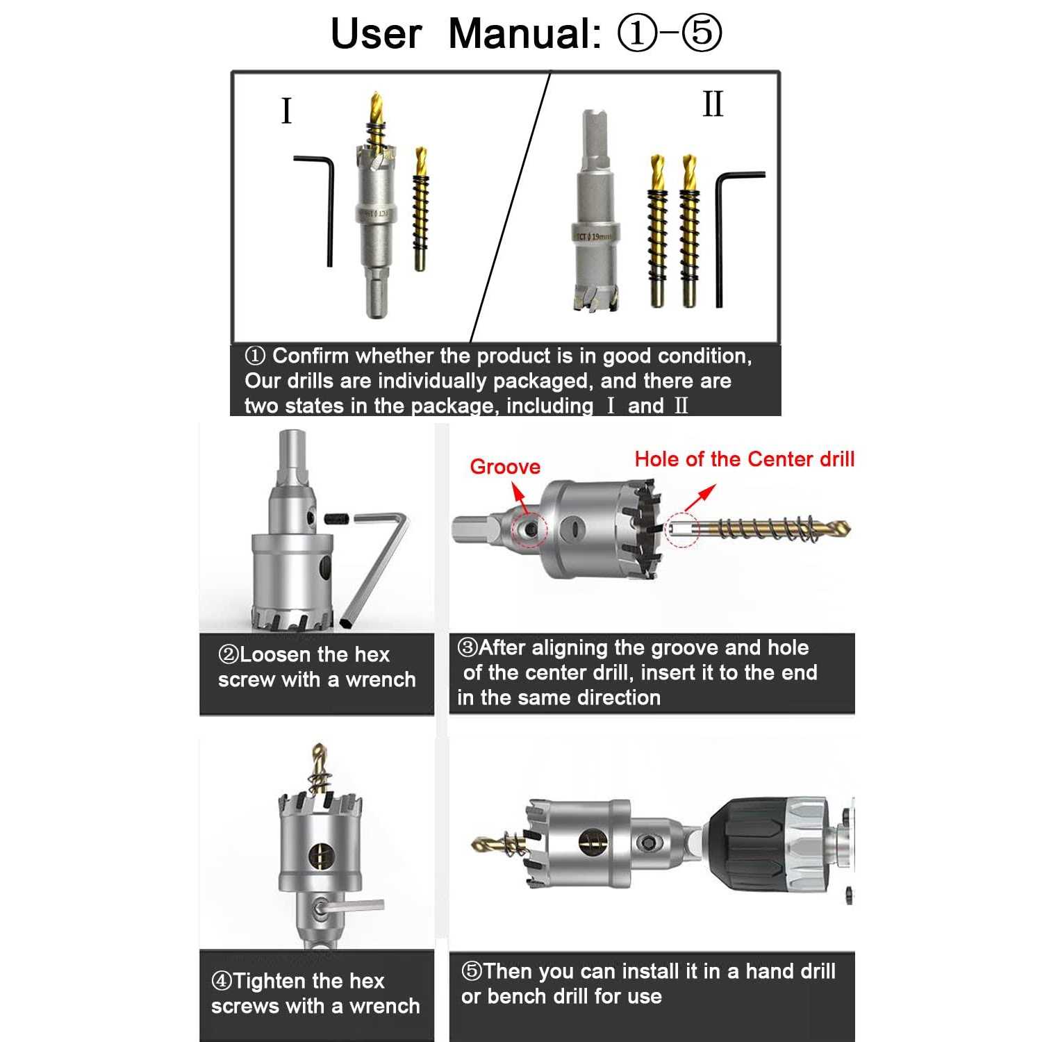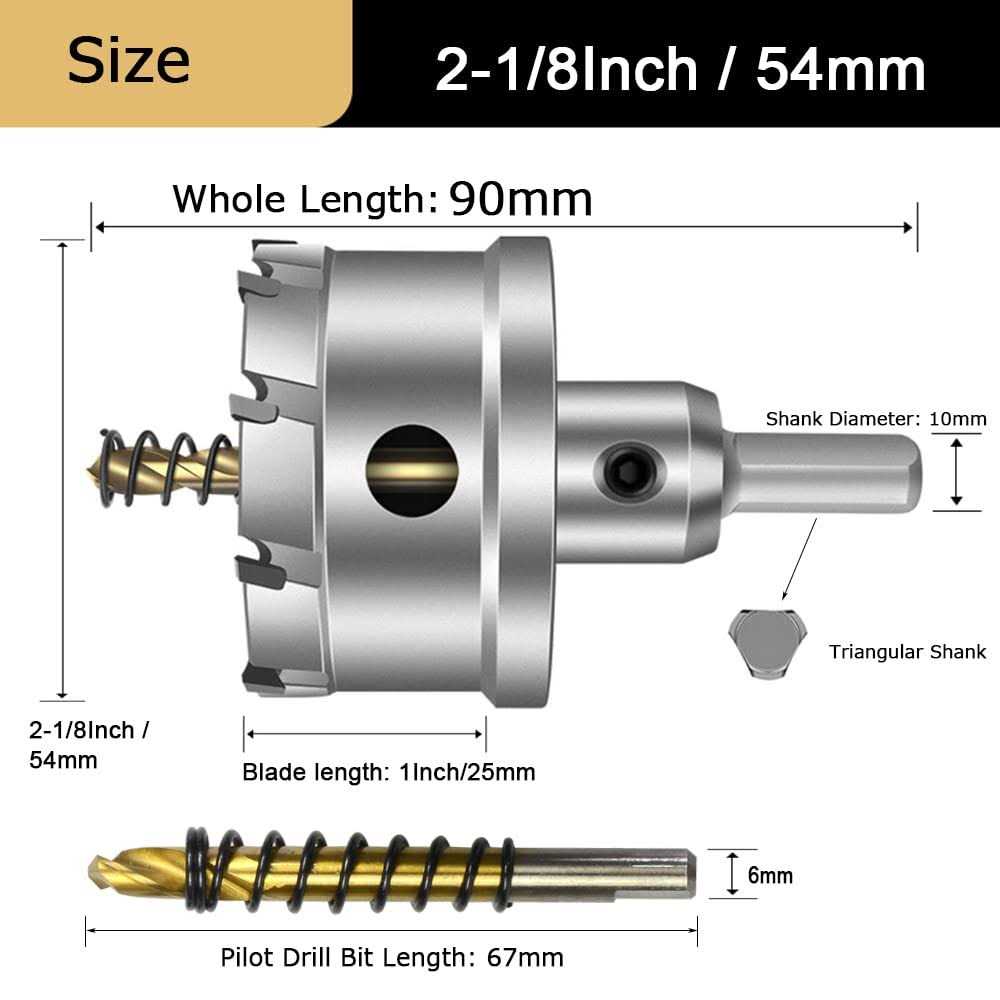 【Top Quality】Made from high quality TCT Carbide( Tungsten Carbide Tipped Cutters), High-grade Titanium-plated cemented carbide Tooth, ensuring its high hardness, rust proof, sturdy and durable; 【Size】Cutting diameter:2-1/8Inch, Cutting Length: 1Inch, Shank Dia.: 2/5 Inch(10mm) , perfect for drilling Hard Metal; 【Unique Three-blade Design】 This TCT hole Saw teeth designed with Three-blade, Include outer blade, middle blade, and inner blade, making it sharper and more efficient, ideal for cutting hard metals; 【Multipurpose Tools】This Carbide Hole saw set apply to Bench drill, magnetic drill, gun drill, drill percussion and so on. Perfect for hard metal, stainless steel plate, square tube, iron, cast iron, wood, F.R.P and other general sheet metal;Note: Cannot be used for concrete, tiles and stone. 【High precision and Easy to Use】TCT Carbide Steel teeth for fast cutting of clean, round holes. Sharp gears and anti-cutting with lower consumption make the product a long service life; br br br Specification: /b br Suitable for: stainless steel, steel plate,iron, aluminum, and various types of pipes; br Material: TCT Carbide; br Cutting diameter:2-1/8Inch(54mm); br Cutting Length: 1Inch; br Shank Dia.: 2/5 Inch(10mm) br br Package Included: /b br 1 * TCT Hole Saw Cutter br 2 * Titanium-Plated Pilot Drill bit br br Warm Tips: /b Do not forget to use a lubricant so that the bit does not overheat. It can be water or some kind of oil. br Before using the hole drill, you must use a wrench to tighten the hexagonal screws. If you don’t know how to use it, please refer to Figure 6