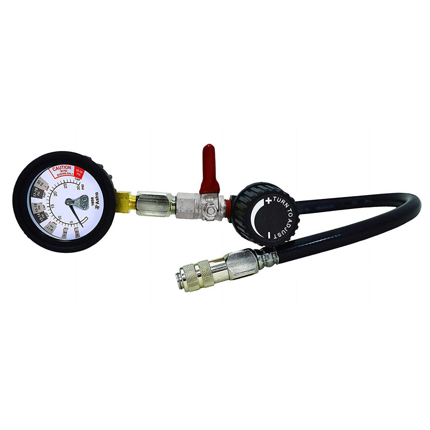 This high quality Astro Pneumatic 7856 Universal Air Powered Cooling System Pressure Tester can test any cooling system or radiator cap for leaks. The quick connector works on nearly all brands of cooling system testing caps and adapters. The regulator will max at 30psi to prevent damage. This pressure tester will get the job done right.