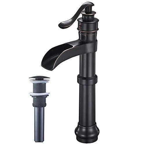 Bathlavish Bathroom Vessel Sink Faucet Oil Rubbed Bronze Black Farmhouse Waterfall Single Hole Tall with Pop Up Drain Assembly Without Overflow One
