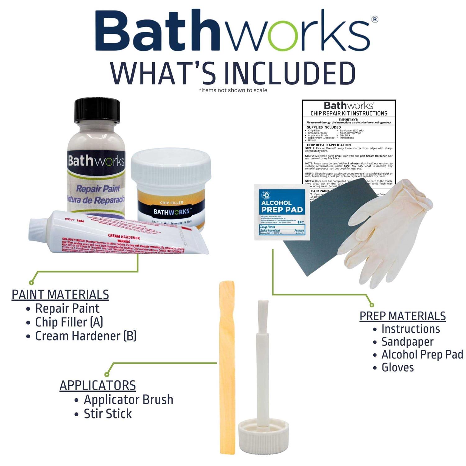 BATHWORKS do it yourself chip repair kit with paint is formulated for all bathtubs, tub/shower units, shower basins and tiles. The chip filler dries in minutes and sands extremely easy with water (sandpaper included in all kits). Finish off the repair with your color of choice topcoat paint using the easy to use cap brush included. BATHWORKS do it yourself chip repair kit are extremely user friendly and lasts as long as the fixture.