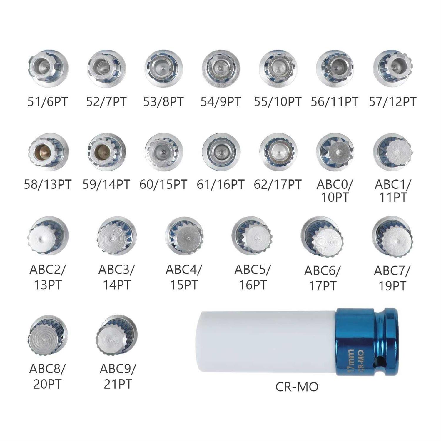 - Wheel Lock Lug Nuts Removal Kit includes 22pcs 17mm sockets: 51/6PT, 52/7PT, 53/8PT, 54/9PT, 55/10PT, 56/11PT, 57/12PT, 58/13PT, 59/14PT, 60/15PT, 61/.