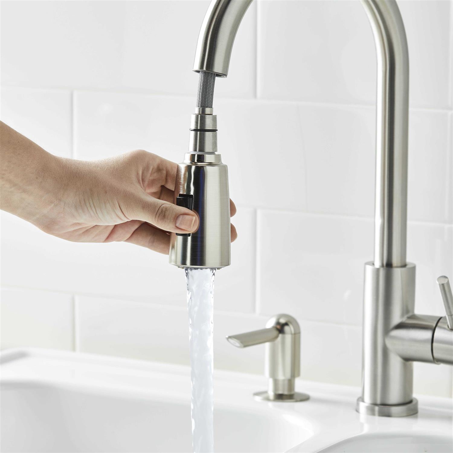 This Better Homes & Gardens Elmont Single Handle Pull-Down Kitchen Faucet in Satin Nickel finish features a matching Soap Dispenser. The perfect blend or strength and beauty, this faucet features a design with a pull-down spray head that can be used in spray or stream function. The included optional deck plate allows for installation in 1 hole or 3 hole sink configurations. This single handle design allows for easy one hand operation of flow control and temperature. Clean periodically, but avoid use of abrasives cleaners, steel wool, or harsh chemicals.