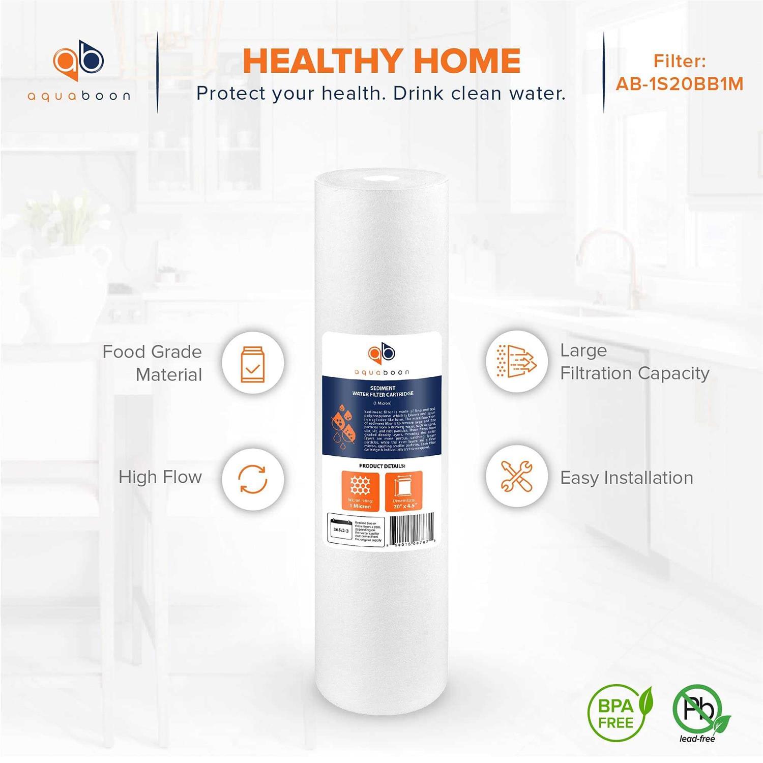 4 OF 1 MICRON 20 BIG BLUE SEDIMENT PP WATER FILTER CARTRIDGES BY AQUABOON Sediment filter is made of fine melted polypropylene, which is blown and spun in a cylinder-like form. The main function of sediment filter is to remove large and fine particles from a drinking water, such as sand, dirt, silt, and rust particles. These filters have graded density layers, meaning the outer layers are more porous, catching larger particles, while the inner layers are a finer micron. Catching smaller particles. Each cartridge is individually shrink-wrapped. Features: Micron rating: 1 Micron Dimensions: 20 x 4.5 Lifetime: Replace two or three times a year, depending on the water quality Individually shrink wrapped Flow rate: 5 GPM Filter life: 20,000 gallons Operating Temperature: 39 deg. F~125 deg. F (4 deg. C~52 deg. C) Max.