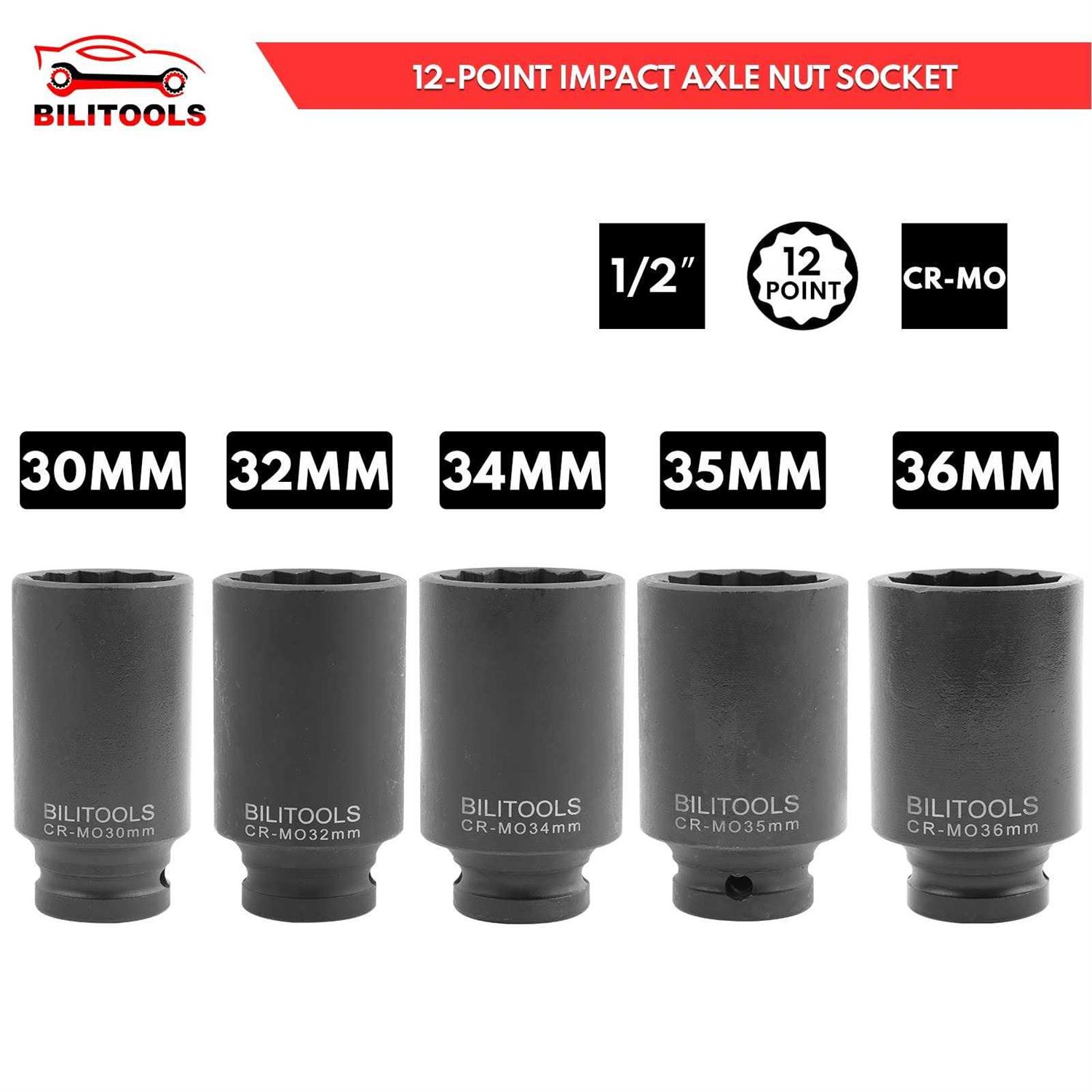 BILITOOLS 1/2″ Drive Deep Axle Nut Spindle Impact Socket Set | 12 Point | Cr-Mo | 14-17 – 19-30 – 32-34 – 35-36 mm