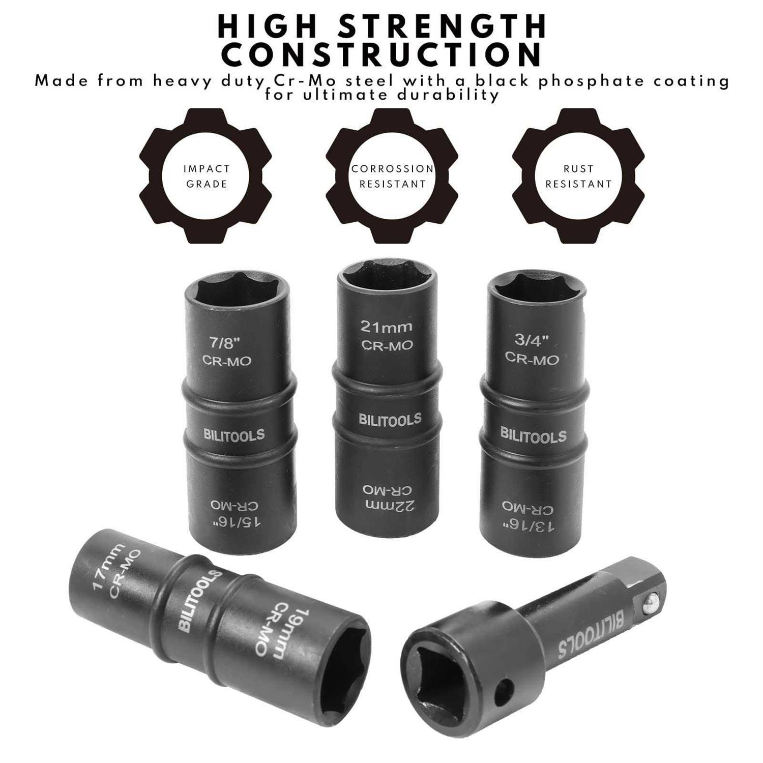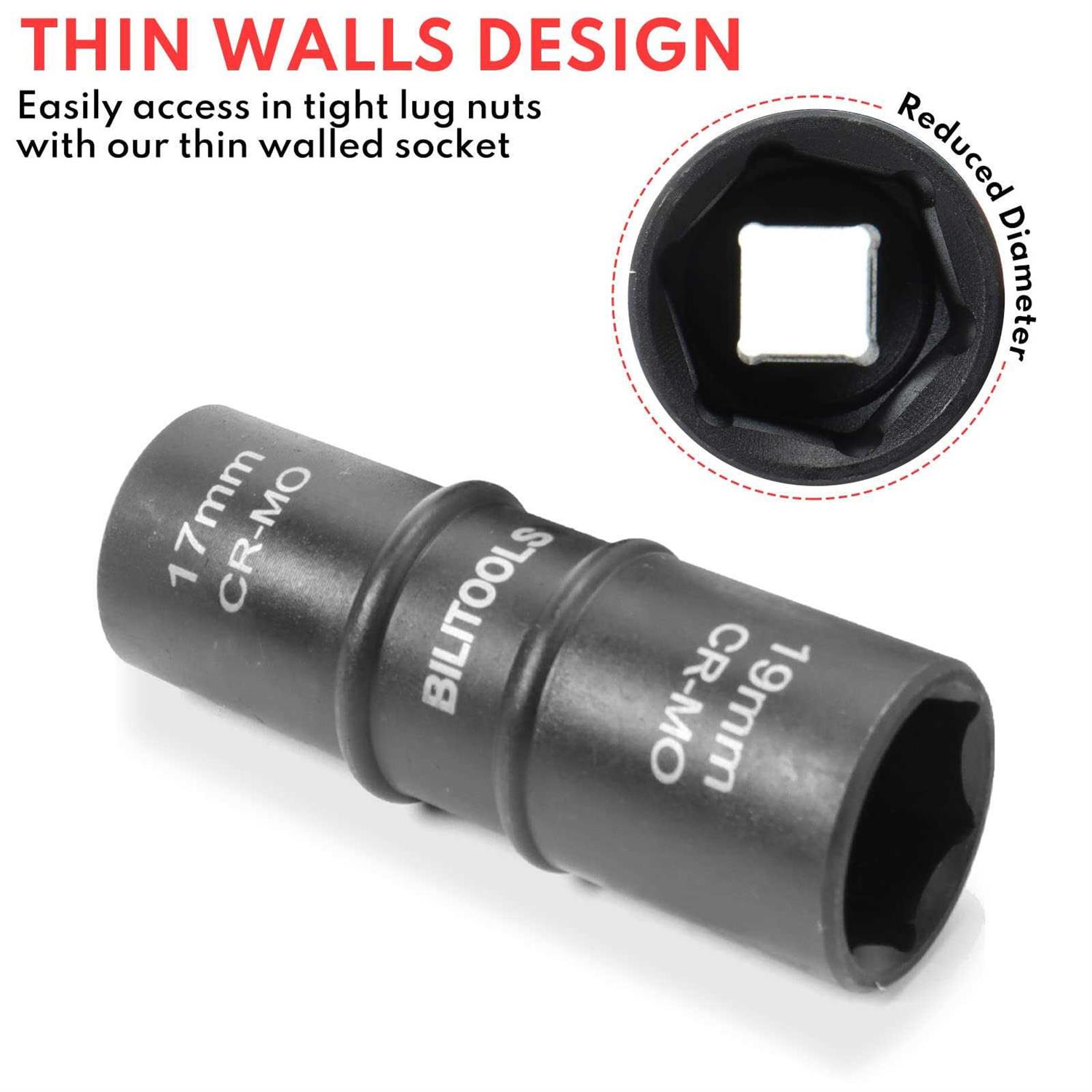 BILITOOLS 1/2 inch Impact Lug Nut Flip Socket Set, Metric 17-19 – 21-22 mm & SAE 3/4-13/16-7/8-15/16 inch, Cr-Mo Thin Wall Wheel B1R95486
