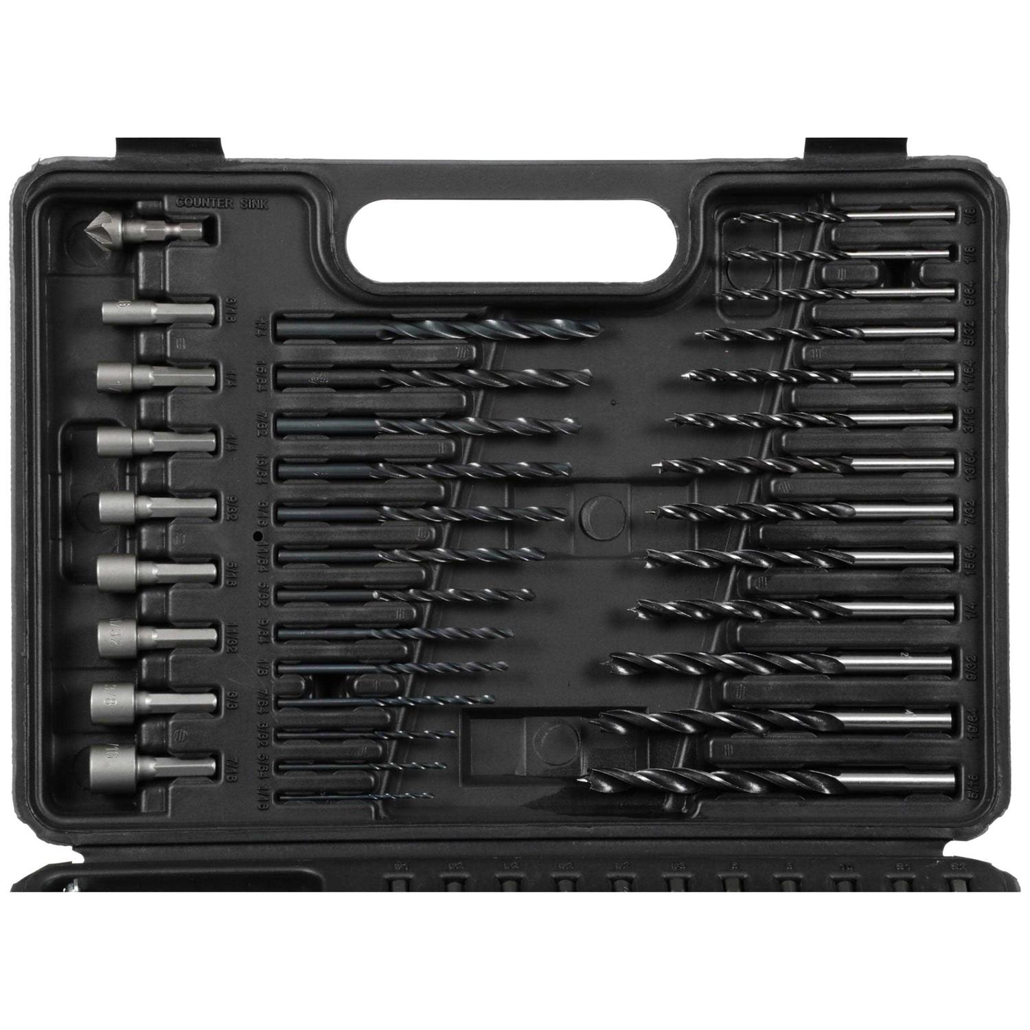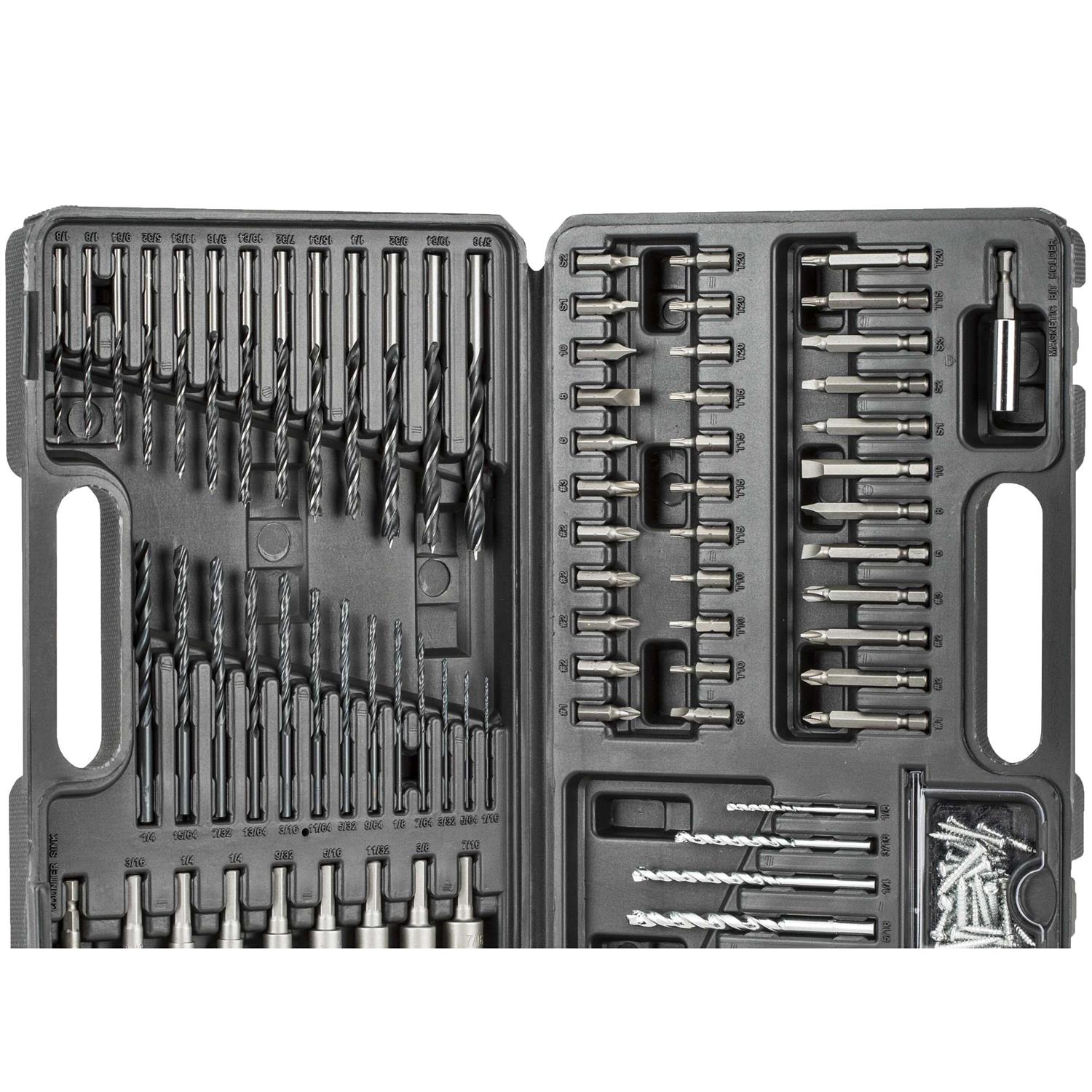 Includes 12 2-in PH SL SQ and star bits 22 1-in PH SL SQ and star bits magnetic bit tip holder 8 nutdrivers 13 brad point drill bits 13 general purpose drill bits 5 masonry drill bits 34 medium and large screws and 1 countersink. Variety of drill bits for use in wood metal plastic and masonry. Ideal sizes of components for frequent use projects and installation. Variety of 2-in and 1-in screwdriving bits for household projects. Durable and portable hard case has extra storage.