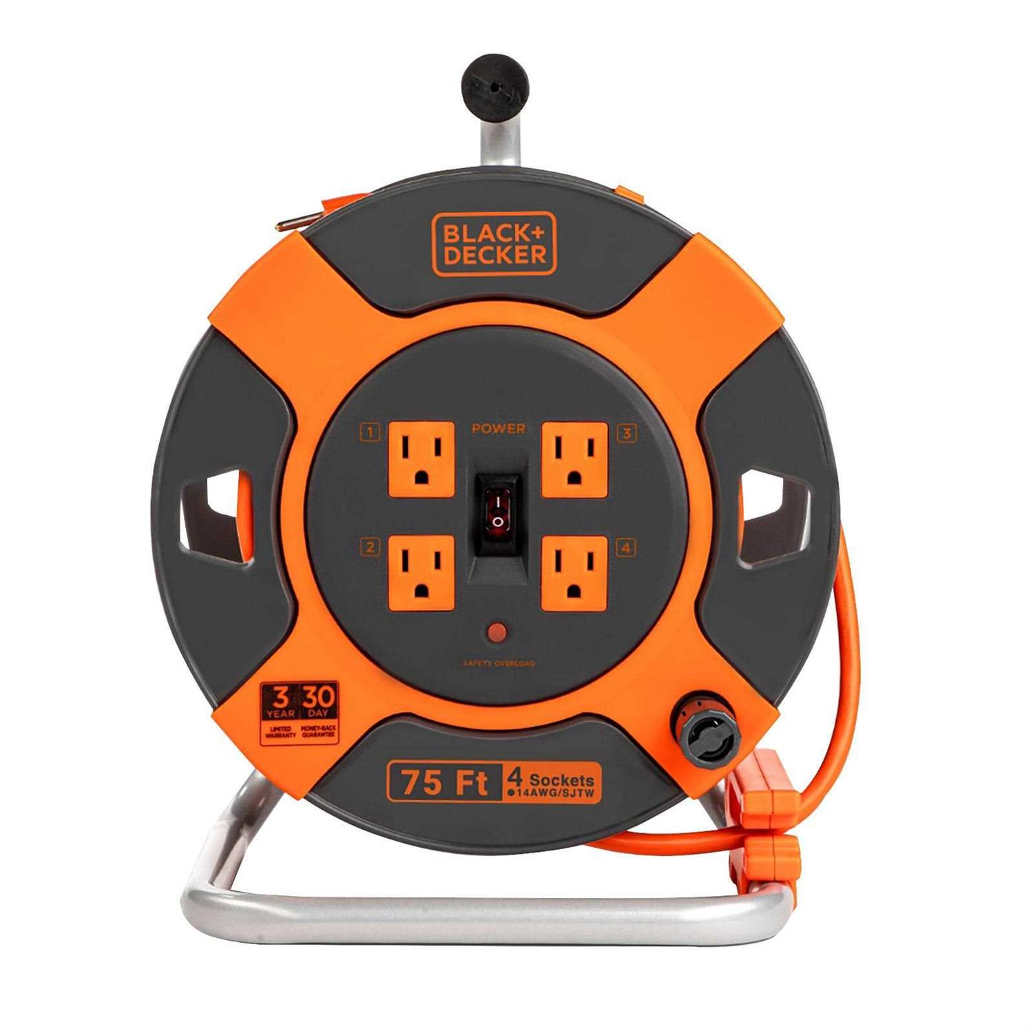 Always supply the power you need while working outside with this Extension Cord Reel with Outlets from BLACK + DECKER. This convenient retractable electric cord reel features a 75-foot, 14AWG cable that makes it ideal for large outdoor spaces and providing heavy-duty power to equipment and tools. It includes a built-in circuit breaker with overload protection, which will automatically go off when the rated current or voltage is exceeded to protect your devices.This retractable power extension cord includes 4 grounded outlets and a handy On/Off switch with a power light indicator. It has a slim, compact design that is easily stored away when not in use, and a comfortable, ergonomic handle so that you can take it anywhere. Our CSA certified electric cord extension is the perfect solution to provide power while youre working in your yard or garden so that you always have enough outlets for power tools, snow blowers, electric lawn mowers, and more. Always have the power you need anywhere with the BLACK + DECKER Extension Cord with Multi-Outlets.