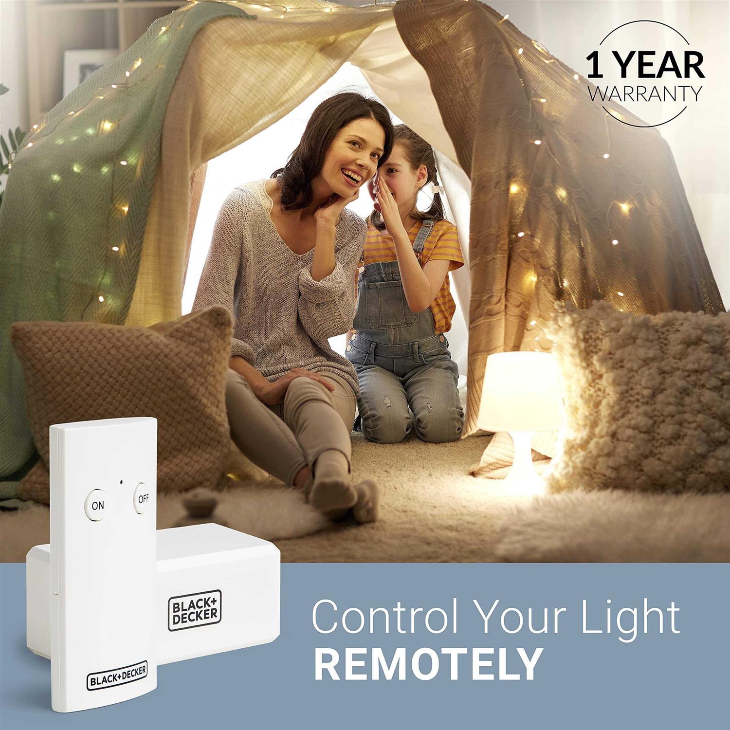 Control any small appliances in your home with the push of a button with this Wireless Outlet Remote Control from Black + Decker! This indoor remote outlet is the perfect way to easily control lights, portable fans, humidifiers, room decorations, holiday or Christmas decor, wall-mounted neon lights, and more. Each wireless remote light switch comes with 1 simple, easy-to-use remote so that control is always at your fingertips! This one-of-a-kind light remote control is designed to provide a strong signal up to 100 feet so that you can easily control any device or small appliance anywhere in your home. Each outlet switch with remote features 1 Polarized 10A Outlet suitable for devices with 2-prong plugs – and they have convenient side plugs to save space in your home! Our remote control plug outlet is already pre-programmed so that you can plug it into an outlet for any device and have easy control. Weve earned a reputation for quality, ingenuity, and value that you can depend on. This CSA-approved indoor remote plug is the perfect way to add convenience anywhere in your home. Just plug it in and make hard-to-reach appliances a thing of the past!