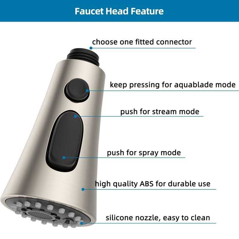 Functional Faucet Spray Headthis Faucet Sprayer Head Is With 3 Water Modes: Stream, Spray, And Aquablade. Aquablade Mode Is A Very Strong Power Mode, Which Can Easily Flush The Food Debris And Is Unique Mode In Market. Easily Switch Between 3 Modes. Connection Sizethis Kitchen Faucet Replacement Head Is Only For G1/2 Connector (Male) (About 2 Cm Or 0.8 Inch), Not Npt, Not Universal, Please Check The Image Of The Dimension About This Product. Easy To Install Simply Unscrew Your Old Shower Head And Replace It With Your New One To Transform Your Kitchen. The Faucet Spray Head Is Made Of Swiss Neubler Bubbler, Which Makes Water Comes Out Softly. Great Qualitythe Kitchen Sink Faucet Head Is Made Of Abs Plastic With Brushed Nickel Finish, Notably The Chrome That Looks Rich And Full Of Life. Engineering Grade Plastic (ABS) Constructed, Ensuring Quality And Longevity. Durable Designthe Sprayer Is Made Of Silicone Nozzles, Easy To Clean, Good Anti- Rust. No Leaking To Save Much Water And Energy.