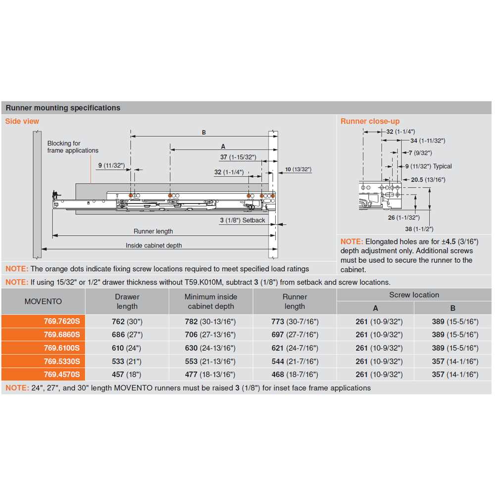 Movento 30Inch Full Extension Undermount Concealed Drawer Slides with BluMotion (Soft Close) MOVENTO TECHNOLOGY: MOVENTO is the latest advancement in concealed runner technology. Standard with soft close BLUMOTION, MOVENTO runners provide multiple solutions with a single runner. Combine with our motion technologies, TIP-ON BLUMOTION or SERVO-DRIVE, to ensure drawers open with a light press of the front and close softly and quietly. MOVENTO concealed runners give you the design freedom for deep, wide draweres that will hold anything homeowners would like to store. From cast iron and stoneware to appliances and pantry items, MOVENTO rises to the challenge while enhancing user experience for generations to come. Features: Full Extension concealed runners for 30” drawer length and up to 33”Cabinet Depth Designed to support up to 170pounds of weight (Static Load Capacity) Compatible with Frameless or Blocked-out face frameCabinets ONLY Four-Dimensional Adjustment & elongated holes for depth adjustment Concealed undermount construction adds stability and support Provides easy access to the drawer with full extension slides Lever disconnect allows easy removal of entire drawer system Compatible with TIP-ON BLUMOTION and SERVO-DRIVE technologies Includes a limited lifetime manufacturer Additional Products Required for Installation Locking Device Required: SKUT51.7601 R andT51.7601 L Wood Screws required: SKUMCFPT587NI-1C Note: For 769. series runners, rear brackets and sockets cannot be used. Cabinet sides must be blocked-out flush with the inside of the frame. See page 13of Movento Catalog for more details. Product Technologies: Self Closing: Gently push on the door front to engage the integrated spring mechanism. Once activated, these slides will close the drawer for you in one smooth movement