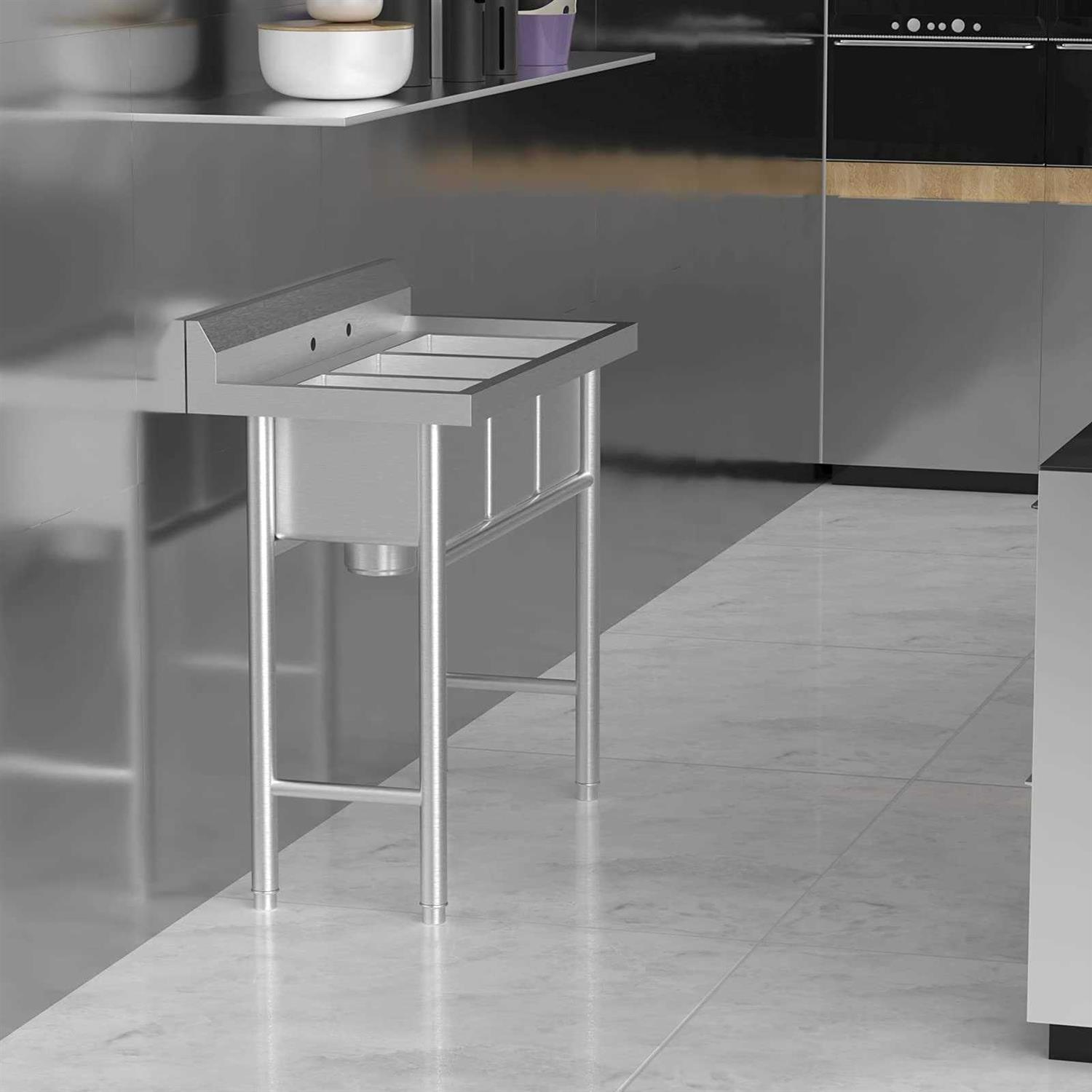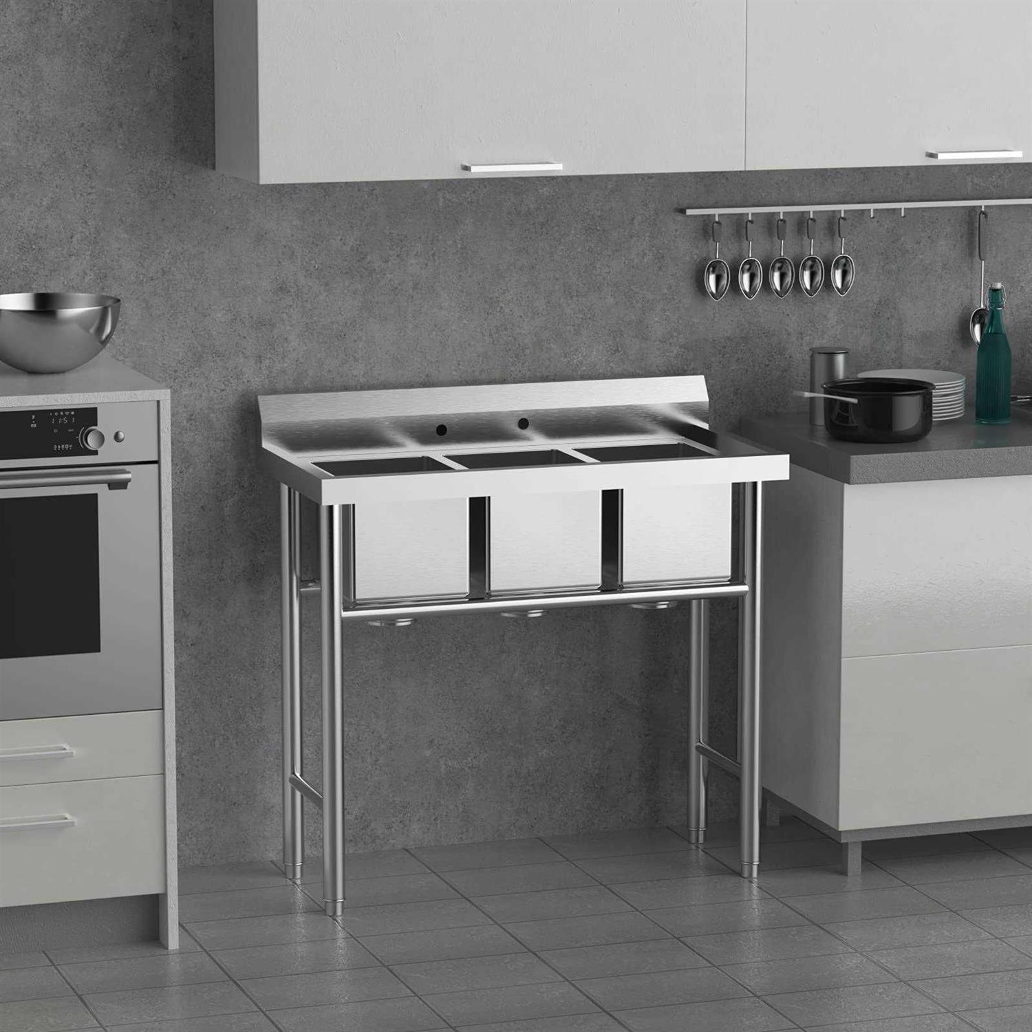 Commercial Sinks by Bonnlo. Details:Bonnlo heavy-duty 3-compartment commercial grade sink is constructed from a combination of premium 18-gauge and 20-gauge 304 stainless-steel. Legs are sturdy and have adjustable levelers. It is a perfect choice for use in garage, laundry room, basement, patio Bar, kitchen, restaurant etc. This triple bowels kitchen sink is large enough for hand-washing, tool cleaning, dish cleaning, filling a bucket, or pre-soaking laundry. You can use it outside when you prep food for the grill and clean fish.