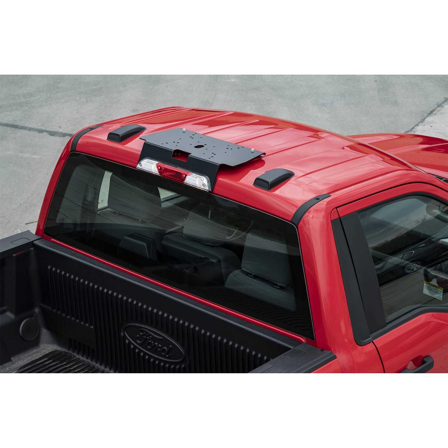 The rooftop mount conveniently bolts into the holes for your vehicle’s OEM third brake light. The one piece construction makes installation quick and easy, and your vehicle’s OEM brake light screws back into your vehicle’s hardware once the install is complete. The mount’s low-profile design means improved aerodynamics. Drill-free cab mounts are not compatible with vehicles equipped with OEM strobe lights in the third brake light area. Not recommended for trucks with LED brake lights. Eliminates the need to drill into the cab roof by installing in the vehicle’s pre-existing OEM third brake light location. Aerodynamic design with 7/8 in. low-profile mounting surface. One piece construction makes for a quick and easy install. Sturdy mount has a 30 lb capacity. 22 in. long, 10 in. deep mounting platform is pre-punched to accommodate a wide range of mini-light bars and beacons. Light-weight, 3/16 in. aluminum construction with a black powder-coated finish.
