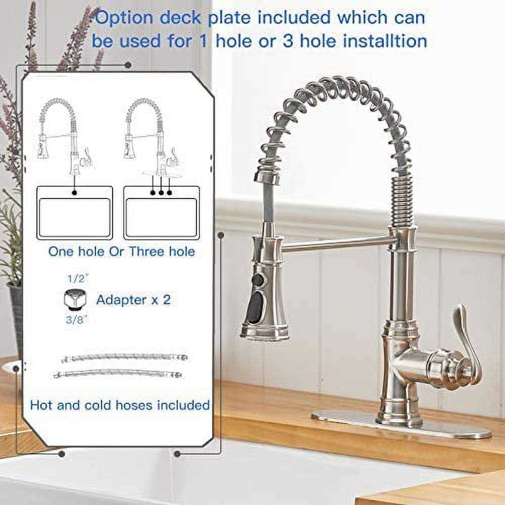 Multifunctional Outlet Water Effect:3 Spray Modes(STREAM/SPRAY/SWEEP)meet varies of wash requirement,stream for filling water, spray for strong rinsing, sweep for cleaning dishes by powerful blade water. Easy Match Design:Brushed Nickel finish protect your faucet from fingerprints or water spots.The kitchen faucet design make your kitchen room simple and fresh,brings timeless style to your kitchen,easy to match most sink. Easy to Install:Designed to fit 1 or 3-hole,10 inch escutcheon included,Pull down hose and water line hoses pre-install in kitchen faucet to save much time under the sink.Clean faucet by cloth is enough in daily use Easy to Use:Single handle design integrates to control water temperature and flow volume easily.High arch 360 degree swivel nozzle supply full range of washing for your kitchen sink. Premium Quality:reliable ceramic cartridge can survive 500,000 times open & close test sensure a stable and long-lasting service life,lead-free material to ensure family health.