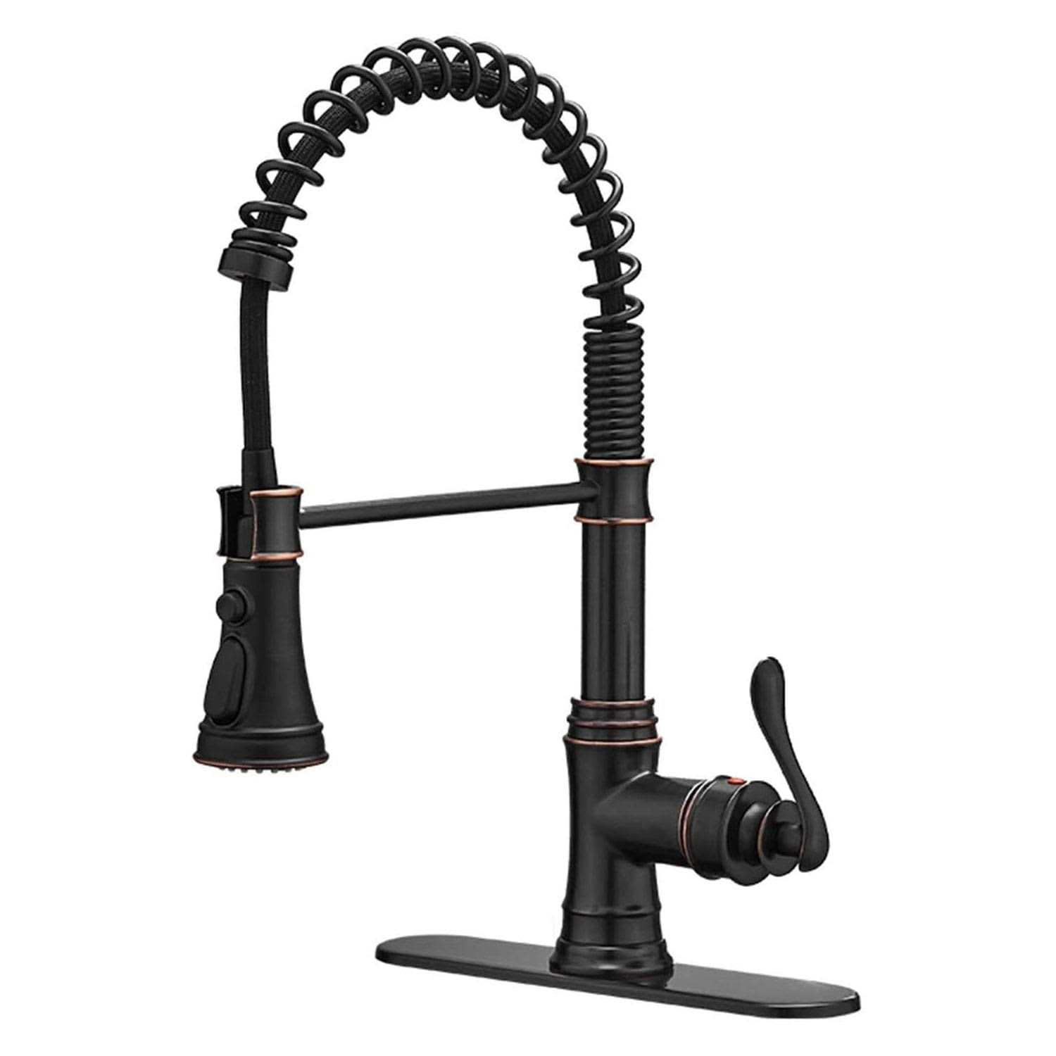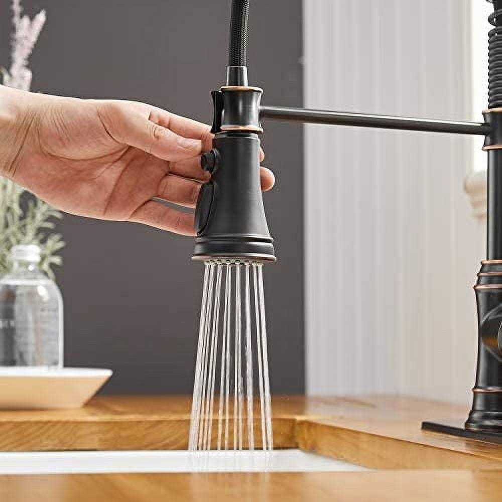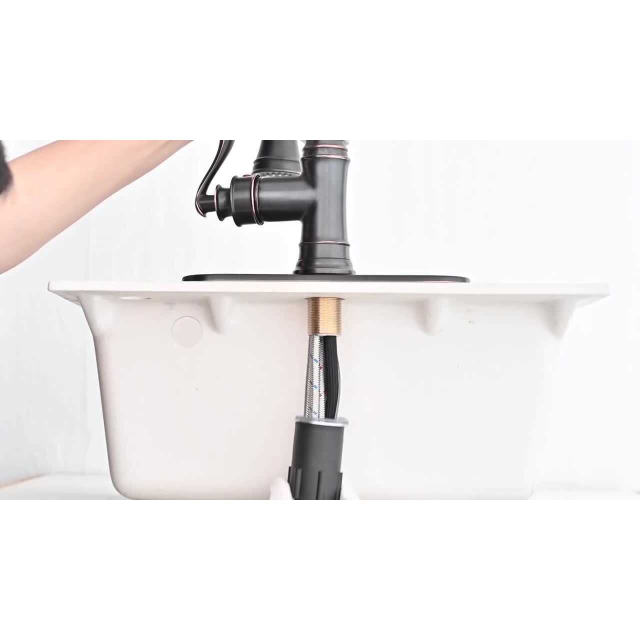 Multifunctional Outlet Water Effect:3 Spray Modes(STREAM/SPRAY/SWEEP)meet varies of wash requirement,stream for filling water, spray for strong rinsing, sweep for cleaning dishes by powerful blade water. Easy Match Design:Oil Rubbed Bronze finish protect your faucet from fingerprints or water spots.The kitchen faucet design make your kitchen room simple and fresh,brings timeless style to your kitchen,easy to match most sink. Easy to Install:Designed to fit 1 or 3-hole,10 inch escutcheon included,Pull down hose and water line hoses pre-install in kitchen faucet to save much time under the sink.Clean faucet by cloth is enough in daily use Easy to Use:Single handle design integrates to control water temperature and flow volume easily.High arch 360 degree swivel nozzle supply full range of washing for your kitchen sink. Premium Quality:reliable ceramic cartridge can survive 500,000 times open & close test sensure a stable and long-lasting service life,lead-free material to ensure family health.